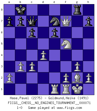Last move : 1-0 2014 September 4 11:21:44 [Event "FICGS__CHESS__NO_ENGINES_TOURNAMENT__000071"] [Site "FICGS"] [Date "2014.05.25"] [Round "1"] [White "Hase,Pavel"] [Black "Goldmund,Heike"] [Result "1-0"] [WhiteElo "2275"] [BlackElo "1491"] 1.d4 d5 2.Nc3 c6 3.e4 dxe4 4.Nxe4 Nf6 5.Nxf6+ gxf6 6.Nf3 Bg4 7.c3 Qc7 8.g3 Nd7 9.Bg2 O-O-O 10.Qc2 Nb6 11.O-O Bh5 12.Qf5+ Kb8 13.Qxh5 e6 14.Bf4 Bd6 15.Bxd6 Rxd6 16.Rae1 Rd5 17.Qh6 Rf5 18.Nh4 Rb5 19.Qxf6 Rg8 20.b3 Nd5 21.Qf3 Ne7 22.Qxf7 Rf5 23.Nxf5 1-0 Queen's pawn : Chigorin variation Queenside Castling by player Black (move 9) Kingside Castling by player White (move 11) Player White won this chess game. Follow this game move after move (download)No other master has such a terrific will to win. At the board he radiates danger, and even the strongest opponents tend to freeze, like rabbits when they smell a panther. Even his weaknesses are dangerous. As white, his opening game is predictable - you can make plans against it - but so strong that your plans almost never work. In the middle game his precision and invention are fabulous, and in the end game you simply cannot beat him. (Anonymous German Expert) Sitze auf Deine Hände. (Siegbert Tarrasch) Un jugador que es sorprendido, esta derrotado a medias. (Proverbio) Comme les marins qui ont mille raisons différentes d'aller en mer, les joueurs d'échecs en ont tout autant avant de s'installer devant une table et jouer... (Vincent Bertignac, philosophe) Tomorrow's what you make of it. (Horatio Caine, C.S.I. Miami)