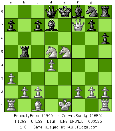Last move : 1-0 2014 May 26 1:23:16 [Event "FICGS__CHESS__LIGHTNING_BRONZE__000526"] [Site "FICGS"] [Date "2014.05.26"] [Round "1"] [White "Pascal,Paco"] [Black "Zurro,Randy"] [Result "1-0"] [WhiteElo "1940"] [BlackElo "1650"] 1.e4 e5 2.a3 Nc6 3.Nf3 h6 4.d4 d5 5.Nc3 Rb8 6.Bb5 Bd7 7.Bxc6 bxc6 8.exd5 cxd5 9.Nxe5 Qe7 10.Nxd5 Qd8 11.Qf3 Rb5 12.Qxf7+ 1-0 Variation Mengarini's Opening : Mengarini's Opening Player White won this chess game. Follow this game move after move (download)When I have White, I win because I am white; When I have Black, I win because I am Bogolyubov. (Bogolyubov) Die Fehler sind da, Sie warten nur darauf gemacht zu werden. (Savielly Grigorievitsch Tartakower) El jugador táctico debe saber que hacer cuando algo se debe de hacer. El estratégico debe saber que hacer cuando nada se debe de hacer. (Savielly Tartakover) Les Echecs sont affaire de jugement sensible. Savoir quand frapper et quand esquiver. (Fischer) Drag your thoughts away from your troubles... by the ears, by the heels, or any other way you can manage it. (Mark Twain)