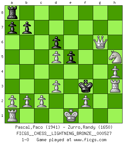 Last move : 1-0 2014 May 26 1:52:22 [Event "FICGS__CHESS__LIGHTNING_BRONZE__000527"] [Site "FICGS"] [Date "2014.05.26"] [Round "1"] [White "Pascal,Paco"] [Black "Zurro,Randy"] [Result "1-0"] [WhiteElo "1941"] [BlackElo "1650"] 1.e4 e5 2.Nf3 d6 3.Bc4 Nf6 4.Ng5 Rg8 5.Bxf7+ Ke7 6.Bxg8 Nxg8 7.d3 Kf6 8.Nf3 Ke6 9.Ng5+ Kf6 10.Nxh7+ Ke7 11.Bg5+ Nf6 12.Nc3 Bg4 13.Qxg4 Kf7 14.Qf5 Nbd7 15.Nd5 g6 16.Qf3 Kg7 17.Nhxf6 c6 18.Nh5+ Kh8 19.Bxd8 cxd5 20.Bf6+ Nxf6 21.Qxf6+ Kh7 22.exd5 Kh6 23.g4 Bg7 24.Qxg7+ Kg5 25.h4+ Kxg4 26.Qxg6+ Kf3 27.Rh3+ 1-0 Philidor's defense Player White won this chess game. Follow this game move after move (download)A chess genius has died; a loss for humanity. (Viktor Kortchnoi, about Bobby Fischer's death) In Buenos Aires ist es nicht mein vorrangiges Ziel ein starkes Turnier zu organisieren, sondern ein Turnier für Gentlemen. Ich würde nie Kamsky einladen. Ich mag keine Probleme. (Miguel Najdorf) La maestría del Ajedrez consiste esencialmente en analizar posiciónes de Ajedrez con precisión. (Mikhail Botvinnik) Toutes les manuvres exécutées sur une colonne ouverte ont pour but ultime l'intrusion définitive sur la septième ou la huitième rangée, en plein cur de la position ennemie. (Aaron Nimzovitch) You can only get smarter by playing a smarter opponent. (Revolver, movie)