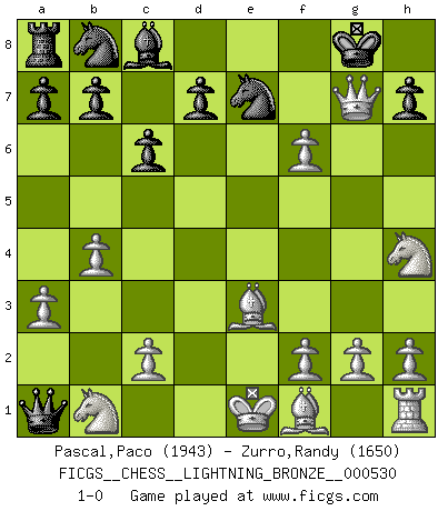 Last move : 1-0 2014 May 26 3:18:18 [Event "FICGS__CHESS__LIGHTNING_BRONZE__000530"] [Site "FICGS"] [Date "2014.05.26"] [Round "1"] [White "Pascal,Paco"] [Black "Zurro,Randy"] [Result "1-0"] [WhiteElo "1943"] [BlackElo "1650"] 1.e4 e5 2.Nf3 f6 3.a3 g5 4.d4 g4 5.Nh4 Ne7 6.dxe5 Bg7 7.Qxg4 O-O 8.exf6 Rxf6 9.e5 c6 10.exf6 Qa5+ 11.b4 Qe5+ 12.Be3 Qxa1 13.Qxg7+ 1-0 Damiano's defense Kingside Castling by player Black (move 7) Player White won this chess game. Follow this game move after move (download)The winner of the game is the player who makes the next-to-last mistake. (Savielly Tartakover) In der Schule lernt man nichts. Es ist nur Zeitverschwendung. (Robert James Fischer) El Ajedrez es una hermosa aventura. (Bent Larsen) Même un GMI sait rarement calculer sur plus de cinq coups une attaque à sacrifices. (Rudolf Spielmann) Patience, use the Force, think ! (Obi-Wan Kenobi in Star Wars ep.2)