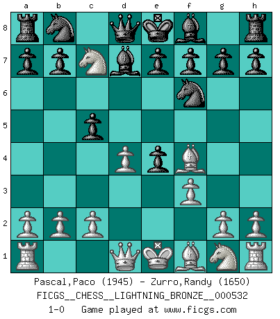 Last move : 1-0 2014 May 26 22:15:19 [Event "FICGS__CHESS__LIGHTNING_BRONZE__000532"] [Site "FICGS"] [Date "2014.05.26"] [Round "1"] [White "Pascal,Paco"] [Black "Zurro,Randy"] [Result "1-0"] [WhiteElo "1945"] [BlackElo "1650"] 1.e4 d5 2.Nc3 Nf6 3.d4 Bg4 4.f3 dxe4 5.Bf4 c5 6.Nb5 Bd7 7.Nc7+ 1-0 Scandinavian (centre counter) defense Player White won this chess game. Follow this game move after move (download)Tactics flow from a superior position. (Bobby Fischer) Irgendwie scheint mir sonntags früh um 9 Uhr der Killerinstinkt verloren gegangen zu sein. (Alexej Shirov) Un Peón pasado aumenta su poder a medida de que el número de piezas en el tablero disminuye. (Capablanca) Même si l'adversaire joue le coup analysé précédemment, recommencez l'analyse en voyant la nouvelle position. Première règle de Blumenfeld A proverb is a short sentence based on long experience. (Miguel de Cervantes)