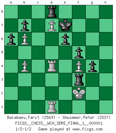 Last move : 1/2-1/2 2007 June 14 8:52:46 [Event "FICGS__CHESS__WCH_SEMI_FINAL_1__000001"] [Site "FICGS"] [Date "2007.02.15"] [Round "7"] [White "Balabaev,Farit"] [Black "Shwimmer,Peter"] [Result "1/2-1/2"] [WhiteElo "2569"] [BlackElo "2537"] 1.e4 c6 2.d4 d5 3.e5 Bf5 4.Nc3 e6 5.g4 Bg6 6.Nge2 Nd7 7.h4 h6 8.Be3 Ne7 9.h5 Bh7 10.Qd2 c5 11.f4 Nc6 12.Bg2 Qa5 13.a3 Rc8 14.dxc5 Bxc5 15.Bxc5 Qxc5 16.Rh3 Nb6 17.b3 O-O 18.g5 hxg5 19.h6 g4 20.Rh5 f5 21.a4 g6 22.Rh1 a6 23.a5 Nd7 24.Na4 Qe7 25.Rd1 g5 26.c4 Ncxe5 27.cxd5 Nf3+ 28.Bxf3 gxf3 29.d6 Qf6 30.Ng3 g4 31.Nh5 Qf7 32.Nb6 Nxb6 33.axb6 Bg6 34.d7 Rcd8 35.Ng7 Qe7 36.Kf2 Rf7 37.Ne8 Qc5+ 38.Kg3 f2 39.Qd4 Qxd4 40.Rxd4 Re7 41.h7+ Bxh7 42.Nf6+ Kg7 43.Nxh7 f1Q 44.Rxf1 Kxh7 45.Rfd1 Kg7 46.b4 Kf8 47.Rd6 Rf7 48.R6d4 Ke7 49.Kg2 R7f8 50.Kg3 Rh8 51.Kg2 Rh3 52.Kf2 Rf3+ 1/2-1/2 Caro-Kann : Advance variation Kingside Castling by player Black (move 17) Promotion Queen by player Black (move 43) This chess game ended in a draw. Follow this game move after move (download)I won't play with you anymore. You have insulted my friend. - When an opponent cursed himself for a blunder. (Miguel Najdorf) Schach ist ein Teil der Kultur, und wenn es mit der Kultur abwärts geht, geht es auch mit dem Schach abwärts. (Mikhail Moiseyevich Botvinik) Si el Ajedrez es una ciencia, es la mas inexacta. Si el Ajedrez es un arte, es demasiado inexacto para ser visto como tal. Si el Ajedrez es un deporte, es demasiado esotérico. Si el Ajedrez es un juego, es demasiado exigente para ser solo un juego. Si el Ajedrez es una aventura, es una muy demandante. Si el Ajedrez es una pasión, es una muy gratificante. Si el Ajedrez es la vida, es una muy triste. (Anónimo) Il s'avisa de me proposer d'apprendre les échecs qu'il jouait un peu... me voilà forcené des échecs. J'achète un échiquier, je m'enferme dans ma chambre, j'y passe des jours et des nuits à vouloir apprendre par cur toutes les parties. (Jean-Jacques Rousseau, Confessions) May I never be complete. May I never be content. May I never be perfect. Deliver me, Tyler, from being perfect and complete. (Chuck Palahniuk, Fight Club)