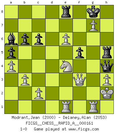 Last move : 1-0 2014 August 12 0:2:34 [Event "FICGS__CHESS__RAPID_A__000161"] [Site "FICGS"] [Date "2014.05.27"] [Round "1"] [White "Modrant,Jean"] [Black "Delaney,Alan"] [Result "1-0"] [WhiteElo "2000"] [BlackElo "2053"] 1.e4 d6 2.d4 Nf6 3.Nc3 e5 4.Nf3 Nbd7 5.Bc4 Be7 6.O-O O-O 7.Re1 c6 8.a4 a5 9.h3 Nb6 10.Ba2 Nfd7 11.dxe5 dxe5 12.Be3 h6 13.g4 Qc7 14.g5 Bxg5 15.Nxg5 hxg5 16.Bxg5 Nc5 17.Kh2 g6 18.Rg1 Be6 19.Be3 Bxa2 20.Bxc5 Be6 21.Qh5 Kg7 22.f4 Rh8 23.Bxb6 Qxb6 24.Qxe5+ Kg8 25.f5 Bc4 26.Qg3 Qd8 27.b3 Ba6 28.fxg6 f6 29.Rae1 b6 30.g7 Rh5 31.e5 f5 32.e6 Qh4 33.Qf3 Re8 34.Ne4 1-0 Pirc defense Kingside Castling by player White (move 6) Kingside Castling by player Black (move 6) Player White won this chess game. Follow this game move after move (download)Excellence at Chess is one mark of a scheming mind. (Sir Arthur Conan Doyle) Wenn Du nicht kämpfst, um anderen etwas zu beweisen, sondern nur für Dich selbst, dann bist du fast unbesiegbar. (Garry Kasparov) Para mi, el Ajedrez es la vida y cada partida es como una nueva vida. Todo jugador de Ajedrez suele vivir muchas vidas durante su vida. (Eduard Gufeld) Les échecs sont utiles à l'exercice de la faculté de penser et à celle de l'imagination. Car nous devons posséder une méthode élaborée pour atteindre des buts partout où nous devons conduire notre raison. (Leibnitz) No enterprise is more likely to succeed than one concealed from the enemy until it is ripe for execution. (Niccolo Machiavelli)