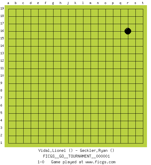 Last move : 1-0 2006 July 2 0:30:38 [Event "FICGS__GO__TOURNAMENT__000001"] [Site "FICGS"] [Date "2006.05.26"] [Round "1"] [Black "Vidal,Lionel"] [White "Geckler,Ryan"] [Result "1-0"] 1.r16 1-0 This go game has been lost on time (started : 2006.05.26 10:47:39) Here are the names of the openings (joseki) played in the four corners : Player Black won this Go (weiqi, baduk) game. Follow this game move after move (download)Attach to the strongest stone in a pincer. (Anonymous) The meaning of life is that it is to be lived, and it is not to be traded and conceptualized and squeezed into a pattern of systems. (Bruce Lee)