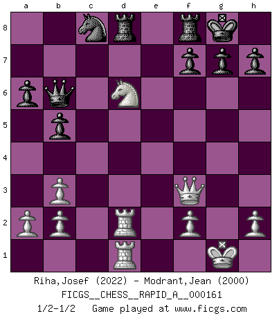 Last move : 1/2-1/2 2014 June 7 17:23:37 [Event "FICGS__CHESS__RAPID_A__000161"] [Site "FICGS"] [Date "2014.05.27"] [Round "1"] [White "Riha,Josef"] [Black "Modrant,Jean"] [Result "1/2-1/2"] [WhiteElo "2022"] [BlackElo "2000"] 1.e4 c5 2.Nf3 d6 3.d4 cxd4 4.Nxd4 Nf6 5.Nc3 a6 6.Be3 e5 7.Nf3 Be7 8.Bc4 O-O 9.O-O Be6 10.Bb3 Nc6 11.Bg5 Nd7 12.Bxe7 Qxe7 13.Nd5 Qd8 14.Qe2 Nc5 15.Rad1 b5 16.Ne3 Nxe4 17.Qd3 Bxb3 18.cxb3 Ng5 19.Nf5 e4 20.Qe3 Nxf3+ 21.gxf3 Ne7 22.Nxd6 exf3 23.Qxf3 Qb6 24.Rd2 Rad8 25.Rfd1 Nc8 1/2-1/2 Sicilian : Najdorf, Byrne (English) attack Kingside Castling by player Black (move 8) Kingside Castling by player White (move 9) This chess game ended in a draw. Follow this game move after move (download)Avoid the crowd. Do your own thinking independently. Be the Chess player, not the Chess piece. (Ralph Charell) Ein guter Spieler hat immer Glück. (José Raúl Capablanca) Cuando le juegas a Fischer, no es una cuestion de si vas a ganar o perder. Es una cuestion de si vas a sobrevivir. (Boris Spassky) Aux échecs, les retours au sommet sont rares : les dommages psychologiques consécutifs à une défaite sont trop sévères. (Daily Telegraph) Internal peace cannot coexist with external war. (Don Groves)