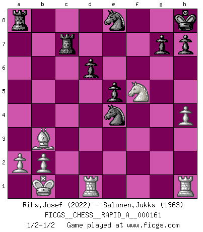 Last move : 1/2-1/2 2014 June 16 10:29:26 [Event "FICGS__CHESS__RAPID_A__000161"] [Site "FICGS"] [Date "2014.05.27"] [Round "1"] [White "Riha,Josef"] [Black "Salonen,Jukka"] [Result "1/2-1/2"] [WhiteElo "2022"] [BlackElo "1963"] 1.e4 c5 2.Nf3 d6 3.d4 cxd4 4.Nxd4 Nf6 5.Nc3 e5 6.Nb3 Be7 7.f3 a6 8.Be3 Be6 9.Qd2 O-O 10.O-O-O Nbd7 11.g4 b5 12.g5 b4 13.Ne2 Ne8 14.f4 a5 15.f5 a4 16.fxe6 axb3 17.exf7+ Rxf7 18.Kb1 bxc2+ 19.Qxc2 Bxg5 20.Bxg5 Qxg5 21.Ng3 Kh8 22.Nf5 Ndf6 23.h4 Qg4 24.Bc4 Rc7 25.Qd3 b3 26.Bxb3 Qxe4 27.Qxe4 Nxe4 1/2-1/2 Sicilian Kingside Castling by player Black (move 9) Queenside Castling by player White (move 10) This chess game ended in a draw. Follow this game move after move (download)Chess is the art of analysis. (Mikhail Botvinnik) Frage des Reporters: -Welche besonderen Umstände rechtfertigen das Anhalten der Uhren während einer Turnierpartie? Antwort: -Einen Fotographen zu strangulieren. (Siegbert Tarrasch) Un Peón pasado aumenta su poder a medida de que el número de piezas en el tablero disminuye. (Capablanca) Toutes les manuvres exécutées sur une colonne ouverte ont pour but ultime l'intrusion définitive sur la septième ou la huitième rangée, en plein cur de la position ennemie. (Aaron Nimzovitch) At last I discovered the true beauty of chess. So I proposed to her. (Dinesh De Silva)