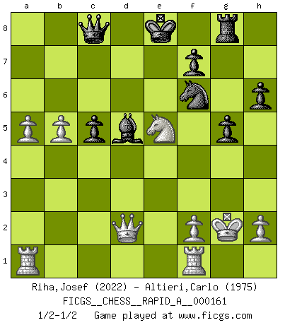 Last move : 1/2-1/2 2014 June 11 11:24:14 [Event "FICGS__CHESS__RAPID_A__000161"] [Site "FICGS"] [Date "2014.05.27"] [Round "1"] [White "Riha,Josef"] [Black "Altieri,Carlo"] [Result "1/2-1/2"] [WhiteElo "2022"] [BlackElo "1975"] 1.e4 c6 2.d4 d5 3.Nc3 dxe4 4.Nxe4 Nd7 5.Bc4 Ngf6 6.Ng5 e6 7.Qe2 Nb6 8.Bd3 h6 9.N5f3 c5 10.dxc5 Nbd7 11.b4 a5 12.c3 axb4 13.cxb4 b6 14.Nd4 Nd5 15.Nc6 Qc7 16.Qxe6+ Ne7 17.Qe2 Qxc6 18.Be4 Qa4 19.Bxa8 Qxa8 20.Nf3 bxc5 21.b5 Nf6 22.O-O Be6 23.a4 Ned5 24.Ne5 Bd6 25.Ng6 Rg8 26.Bb2 Qc8 27.Be5 Bxe5 28.Nxe5 Nf4 29.Qd2 g5 30.a5 Nxg2 31.Kxg2 Bd5+ 1/2-1/2 Caro-Kann : Steinitz variation Kingside Castling by player White (move 22) This chess game ended in a draw. Follow this game move after move (download)The blunders are all there on the board, waiting to be made. (Savielly Tartakover) Es ist besser die Steine des Gegners zu opfern. (Savielly Grigorievitsch Tartakower) Me siento como si fuera una pieza en una partida de Ajedrez, cuando mi oponente me indica: esa pieza no puede ser movida. (Soren Kierkegaard) Les Echecs représentent une sphère d'idées créatrices basée sur la volonté des deux protagonistes. (Smyslov) Gambling is the son of avarice and the father of despair. (French proverb)