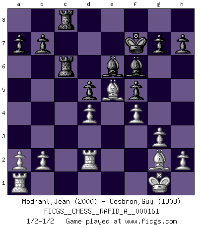 Last move : 1/2-1/2 2014 August 1 4:14:44 [Event "FICGS__CHESS__RAPID_A__000161"] [Site "FICGS"] [Date "2014.05.27"] [Round "1"] [White "Modrant,Jean"] [Black "Cesbron,Guy"] [Result "1/2-1/2"] [WhiteElo "2000"] [BlackElo "1903"] 1.c4 e5 2.Nc3 d6 3.g3 f5 4.d4 Be7 5.Bg2 Nf6 6.Nf3 e4 7.Ng5 c6 8.Nh3 Na6 9.O-O O-O 10.f3 exf3 11.exf3 d5 12.cxd5 Nxd5 13.Nf4 Nac7 14.Qb3 Bf6 15.Ncxd5 Nxd5 16.Nxd5 Qxd5 17.Qxd5+ cxd5 18.Rd1 Be6 19.Bf4 Rac8 20.Rd2 Rc6 21.Be5 Kf7 22.f4 Rfc8 1/2-1/2 English Opening Kingside Castling by player White (move 9) Kingside Castling by player Black (move 9) This chess game ended in a draw. Follow this game move after move (download)The older I grow, the more I value pawns. (Paul Keres) Bobby Fischer ist kein Vorbild für die heutige Jugend. (Viktor Kortschnoi) Fischer no está bajo la obligación de nadie. (Joseph Platz) Même si l'adversaire joue le coup analysé précédemment, recommencez l'analyse en voyant la nouvelle position. Première règle de Blumenfeld Whenever people agree with me, I always feel I must be wrong. (Oscar Wilde)