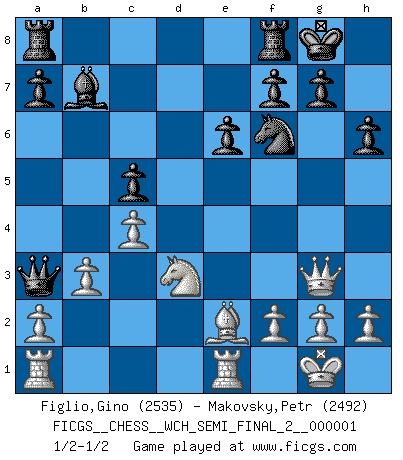 Last move : 1/2-1/2 2007 March 10 8:25:50 [Event "FICGS__CHESS__WCH_SEMI_FINAL_2__000001"] [Site "FICGS"] [Date "2007.02.15"] [Round "1"] [White "Figlio,Gino"] [Black "Makovsky,Petr"] [Result "1/2-1/2"] [WhiteElo "2535"] [BlackElo "2492"] 1.d4 Nf6 2.Nf3 d5 3.c4 e6 4.Nc3 c6 5.e3 Nbd7 6.Qc2 Bd6 7.b3 O-O 8.Be2 b6 9.O-O Bb7 10.Bb2 Qe7 11.Rfe1 h6 12.e4 dxe4 13.Nxe4 Nxe4 14.Qxe4 Nf6 15.Qh4 Ba3 16.Bc3 Bb4 17.Bxb4 Qxb4 18.Ne5 c5 19.Nd3 Qa3 20.dxc5 bxc5 21.Qg3 1/2-1/2 Queen's pawn game Kingside Castling by player Black (move 7) Kingside Castling by player White (move 9) This chess game ended in a draw. Follow this game move after move (download)In the perfect Chess combination as in a first-rate short story, the whole plot and counter-plot should lead up to a striking finale, the interest not being allayed until the very last moment. (Yates and Winter) Der Schachmeister von Heute braucht Courage, einen Killerinstinkt, Ausdauer und Arroganz. (Larry Evans) Las ideas audaces son como las piezas del Ajedrez que avanzan hacia adelante. Ellas pueden ser vencidas, pero también pueden iniciar una partida victoriosa. (Goethe) Il a essayé de se convaincre qu'il pourrait empêcher toutes les erreurs et ne jamais perdre. L'horreur ! Gary Kasparov au sujet de Robert Fischer. There is far too much law for those who can afford it and far too little for those who cannot. (Derek Bok)
