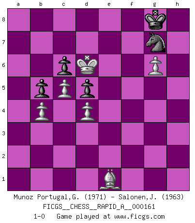 Last move : 1-0 2014 August 24 12:10:37 [Event "FICGS__CHESS__RAPID_A__000161"] [Site "FICGS"] [Date "2014.05.27"] [Round "1"] [White "Munoz Portugal,Guillermo"] [Black "Salonen,Jukka"] [Result "1-0"] [WhiteElo "1971"] [BlackElo "1963"] 1.d4 d5 2.c4 e6 3.Nf3 Nf6 4.Bg5 Be7 5.e3 Nbd7 6.cxd5 exd5 7.Nc3 c6 8.Bd3 O-O 9.h3 Ne4 10.Bf4 f5 11.O-O Ndf6 12.Rc1 Be6 13.Qb3 Qb6 14.Qc2 Nh5 15.Na4 Qa5 16.Be5 Nhf6 17.a3 Qd8 18.b4 a5 19.Rb1 b5 20.Nc5 Qc8 21.Rfc1 axb4 22.axb4 Nxc5 23.dxc5 Bd7 24.Ra1 Ne4 25.Rxa8 Qxa8 26.Ra1 Qb7 27.Qa2 Ng5 28.Nd4 Nf7 29.Bg3 Bf6 30.Qa6 Qxa6 31.Rxa6 Bxd4 32.exd4 Rd8 33.Ra7 g6 34.f4 Be8 35.Bh4 Rd7 36.Ra8 Kf8 37.Kf2 Nh6 38.Kf3 Rg7 39.Bf6 Rb7 40.g4 Ng8 41.Be5 fxg4+ 42.hxg4 Kf7 43.f5 g5 44.Ra6 Bd7 45.Ra8 Be8 46.f6 Bd7 47.Bxh7 Nxf6 48.Bf5 Ng8 49.Rd8 Be8 50.Rd6 Kf8 51.Bg6 Bxg6 52.Rxg6 Rf7+ 53.Kg2 Ne7 54.Rxg5 Ke8 55.Kg3 Rf1 56.Rg7 Rf7 57.Rxf7 Kxf7 58.Kf4 Ng6+ 59.Kg5 Ne7 60.Bc7 Ng6 61.Bd6 Kg7 62.Be5 Kf7 63.Bf6 Nf8 64.Kf5 Nd7 65.g5 Nb8 66.g6 Kg8 67.Bh4 Na6 68.Be1 Nc7 69.Ke5 Ne8 70.Ke6 Ng7+ 71.Kd6 1-0 QGD Kingside Castling by player Black (move 8) Kingside Castling by player White (move 11) Player White won this chess game. Follow this game move after move (download)After black's reply to 1.e4 with 1..e5, leaves him always trying to get into the game. (Howard Staunton) Gott hat gewollt, dass ich Champion werde. (Surab Azmajparaschvili) Alekhine es un poeta que crea un trabajo de arte de algo que raramente inspiraría a otra persona a mandar una tarjeta postal. (Max Euwe) A chaque perte on perd un peu de soi. (Joël Lautier) A computer lets you make more mistakes faster than any invention in human history - with the possible exceptions of handguns and tequila. (Mitch Ratcliffe)