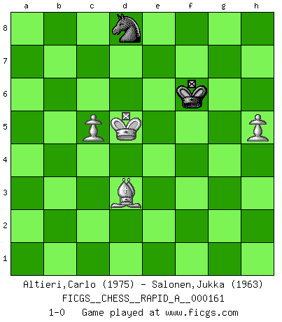 Last move : 1-0 2014 August 13 8:59:22 [Event "FICGS__CHESS__RAPID_A__000161"] [Site "FICGS"] [Date "2014.05.27"] [Round "1"] [White "Altieri,Carlo"] [Black "Salonen,Jukka"] [Result "1-0"] [WhiteElo "1975"] [BlackElo "1963"] 1.e4 c5 2.Ne2 Nf6 3.Nbc3 d6 4.d4 cxd4 5.Nxd4 a6 6.Be3 e5 7.Nb3 Be6 8.a3 Be7 9.f3 O-O 10.Qd2 Nbd7 11.O-O-O b5 12.g4 Qc7 13.g5 Nh5 14.Nd5 Bxd5 15.exd5 Nb6 16.Kb1 Rab8 17.Na5 Nxd5 18.Qxd5 Qxa5 19.Bc4 Qd8 20.Ba2 Bxg5 21.Bxg5 Qxg5 22.Qxd6 Qf6 23.Qxf6 Nxf6 24.Rd6 a5 25.Rg1 Kh8 26.Ra6 Ra8 27.Rxa8 Rxa8 28.Re1 Re8 29.Bxf7 Re7 30.Bb3 g6 31.c3 Kg7 32.Bc2 Nd5 33.Bd3 Nf4 34.Bxb5 Kf6 35.Rd1 Rb7 36.a4 Ke7 37.b3 h5 38.Kb2 g5 39.b4 axb4 40.cxb4 Ne6 41.Rd5 Kf6 42.Kc3 g4 43.fxg4 hxg4 44.a5 e4 45.Bd7 Rc7+ 46.Kd2 Nd4 47.Bxg4 Rc2+ 48.Ke3 Nc6 49.Rf5+ Ke7 50.Rc5 Rxc5 51.bxc5 Nxa5 52.h4 Nc6 53.h5 Kf6 54.Bd7 Ne5 55.Bb5 Kf5 56.Kd4 Kf6 57.Kxe4 Nf7 58.Kd5 Nd8 59.Bd3 1-0 Sicilian : Keres variation (2.Ne2) Kingside Castling by player Black (move 9) Queenside Castling by player White (move 11) 10 pieces endgame at move 47 : White KRBPPP , Black KRNP WHITE : King + 1 Rook 1 Bishop 3 Pawns BLACK : King + 1 Rook 1 Knight 1 Pawn 9 pieces endgame at move 50 : White KBPPP , Black KRNP WHITE : King + 1 Bishop 3 Pawns BLACK : King + 1 Rook 1 Knight 1 Pawn 8 pieces endgame at move 51 : White KBPPP , Black KNP WHITE : King + 1 Bishop 3 Pawns BLACK : King + 1 Knight 1 Pawn 7 pieces endgame at move 51 : White KBPP , Black KNP WHITE : King + 1 Bishop 2 Pawns BLACK : King + 1 Knight 1 Pawn 6 pieces endgame at move 57 : White KBPP , Black KN WHITE : King + 1 Bishop 2 Pawns BLACK : King + 1 Knight Player White won this chess game. Follow this game move after move (download)The isolated Pawn casts gloom over the entire chessboard. (Aaron Nimzovich) Der Verteidiger gebe der Gewalt nach, aber nur der Gewalt. Er schaffe sich nicht freiwillig, etwa aus Blindheit oder aus Schrecken, irgendwelche Schwächen. Er lasse sich nicht bluffen. (Emanuel Lasker) Hasta este punto, las blancas han seguido un análisis bien conocido. Pero ahora el hace un error fatal: empieza a usar su propia cabeza. (Siegbert Tarrasch) Le plus grand jeu de l'esprit jamais inventé, plus vous l'apprenez, plus vous y prenez du plaisir. (Garry Kasparov) The real voyage of discovery consists not in seeking new lands but in seeing with new eyes. (Marcel Proust)