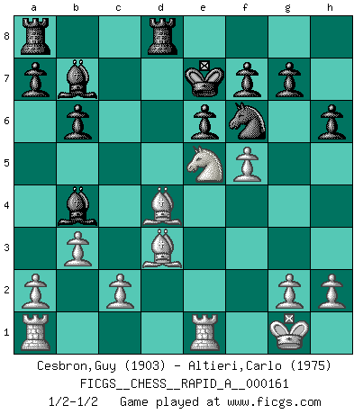Last move : 1/2-1/2 2014 August 3 22:39:55 [Event "FICGS__CHESS__RAPID_A__000161"] [Site "FICGS"] [Date "2014.05.27"] [Round "1"] [White "Cesbron,Guy"] [Black "Altieri,Carlo"] [Result "1/2-1/2"] [WhiteElo "1903"] [BlackElo "1975"] 1.e4 c6 2.d4 d5 3.Nd2 dxe4 4.Nxe4 Nd7 5.Ng5 Ngf6 6.Bd3 e6 7.N1f3 Bd6 8.Qe2 h6 9.Ne4 Nxe4 10.Qxe4 Qc7 11.Qg4 Kf8 12.O-O c5 13.Re1 b6 14.b3 Nf6 15.Qh4 Bb7 16.Ne5 cxd4 17.Qxd4 Qc5 18.Bb2 Qxd4 19.Bxd4 Ke7 20.f4 Rhd8 21.f5 Bb4 1/2-1/2 Caro-Kann : 3.Nd2 Kingside Castling by player White (move 12) This chess game ended in a draw. Follow this game move after move (download)It is peculiar but a fact nevertheless, that gamblers in chess always have enthusiastic followers. (Botvinnik) Ich verstehe den Grund nicht, warum die Aufteilung in Frauen und Männer überhaupt im Schach besteht. (Judith Polgar) El Ajedrez detiene a su maestro dentro de sus propios vínculos, encadenando la mente y el cerebro, por lo que la libertad interior del mas fuerte debe sufrir. (Albert Einstein) Mon pion favori sur ma case favorite ! Bronstein en parlant d'un coup de pion en h5 quand il avait les Noirs. Men should grow up. - Yeah. And dogs should stop licking themselves. It's not gonna happen. (Gregory House to Dr. Cameron, House M.D.)