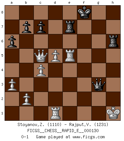 Last move : 0-1 2014 June 8 6:48:53 [Event "FICGS__CHESS__RAPID_E__000130"] [Site "FICGS"] [Date "2014.05.27"] [Round "1"] [White "Stoyanov,Zdravko"] [Black "Rajput,Vishalsingh"] [Result "0-1"] [WhiteElo "1110"] [BlackElo "1231"] 1.e4 e5 2.Nf3 Nc6 3.Bb5 Nge7 4.d3 h6 5.Nc3 a6 6.Bxc6 Nxc6 7.Nd5 Bd6 8.a3 O-O 9.O-O Re8 10.h3 Ne7 11.Nf6+ gxf6 12.Bxh6 Ng6 13.Nh2 Bf8 14.Qh5 Bxh6 15.Qxh6 d5 16.exd5 Qd6 17.c4 Bf5 18.Rad1 Qf8 19.Qh5 Bd7 20.Ng4 Qg7 21.Nh6+ Kf8 22.Nf5 Bxf5 23.Qxf5 Nh4 24.Qe4 f5 25.Qxh4 Rad8 26.Rfe1 Rd6 27.d4 Rh6 28.Qg3 Rg6 29.Qh2 f4 30.g4 fxg3 31.fxg3 f6 32.dxe5 fxe5 33.Qf2+ Rf6 34.Qc5+ Re7 35.Rxe5 Qxg3+ 36.Kh1 Qxh3+ 37.Kg1 Qg3+ 38.Kh1 Rh6+ 0-1 Ruy Lopez : Cozio defense Kingside Castling by player Black (move 8) Kingside Castling by player White (move 9) Player Black won this chess game. Follow this game move after move (download)Weak points or holes in the opponent's position must be occupied by pieces not Pawns. (Siegbert Tarrasch) Schach wird sich dank seiner hohen kulturellen Tradition immer durchsetzen. In näherer Zukunft womöglich sogar als Gegenreaktion auf die maßlose Reizüberflutung im Freizeit- und Spielbereich. (Garry Kasparov) La caracteristica mas importante en la posición del Ajedrez es la actividad de las piezas. Esto es absolutamente fundamental en todas las fases del juego: Apertura, Juego Medio y especialmente Finales. La limitación primordial en la actividad de una pieza, es la estructuración de los Peones. (Michael Stean) Le thème de l'attaque double intervient d'une manière ou d'une autre dans l'immense majorité des combinaisons. (Youri Averbakh) Macintosh - we might not get everything right, but at least we knew the century was going to end. (Douglas Adams)