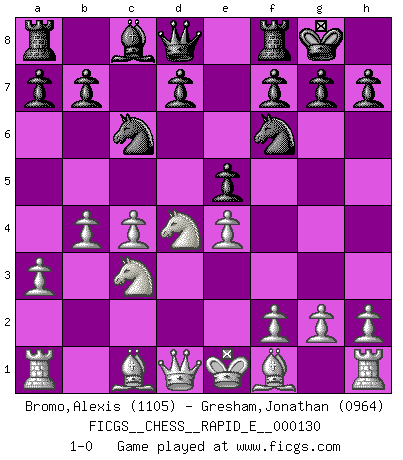 Last move : 1-0 2014 July 27 1:56:46 [Event "FICGS__CHESS__RAPID_E__000130"] [Site "FICGS"] [Date "2014.05.27"] [Round "1"] [White "Bromo,Alexis"] [Black "Gresham,Jonathan"] [Result "1-0"] [WhiteElo "1105"] [BlackElo "0964"] 1.d4 Nf6 2.c4 c5 3.Nc3 cxd4 4.Qxd4 Nc6 5.Qd1 e5 6.e4 Bc5 7.a3 Bb6 8.Nf3 O-O 9.b4 Bd4 10.Nxd4 1-0 This chess game has been lost on time (started : 2014.05.27 16:44:35) Benoni defense Kingside Castling by player Black (move 8) Player White won this chess game. Follow this game move after move (download)Chess, like love, like music, has the power to make people happy. (Siegbert Tarrasch) Schach ist ein Reich, wo sich die menschliche Phantasie frei entfalten kann. (David Bronstein) Fischer es una tragedia del Ajedrez Americano a la par con Morphy y Pillsbury. (Mig Greengard) La tactique, c'est ce que vous faites quand il y a quelque chose à faire; la stratégie, c'est ce que vous faites quand il n'y a rien à faire. (Savielli Tartacower) Wisdom doesn't necessarily come with age. Sometimes age just shows up all by itself. (Tom Watson)