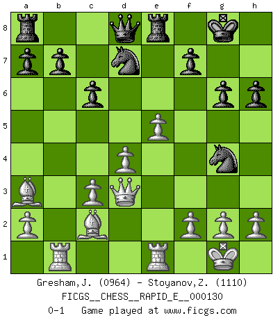Last move : 0-1 2014 July 19 1:15:26 [Event "FICGS__CHESS__RAPID_E__000130"] [Site "FICGS"] [Date "2014.05.27"] [Round "1"] [White "Gresham,Jonathan"] [Black "Stoyanov,Zdravko"] [Result "0-1"] [WhiteElo "0964"] [BlackElo "1110"] 1.d4 d5 2.c4 dxc4 3.e3 h6 4.Bxc4 e6 5.Nf3 Bd6 6.O-O c6 7.Bb3 Nf6 8.Nc3 O-O 9.e4 Bb4 10.Bc2 Bxc3 11.bxc3 Nbd7 12.Ba3 Re8 13.Qd3 e5 14.Rab1 Nb6 15.Rfe1 Bg4 16.Nxe5 Nbd7 17.Nxg4 Nxg4 18.e5 g6 0-1 This chess game has been lost on time (started : 2014.05.27 16:44:35) Queen's gambit accepted Kingside Castling by player White (move 6) Kingside Castling by player Black (move 8) Player Black won this chess game. Follow this game move after move (download)Half the variations which are calculated in a tournament game turn out to be completely superfluous. Unfortunately, no one knows in advance which half. (Jan Tinman) Ein Schachgenie ist jemand der verdammt gut Schach spielt. (Jonathan Levitt) Por tratar de evitar la pérdida de una pieza, muchas personas han perdido una partida de Ajedrez. (Savielly Tartakover) Pour moi, les échecs ne sont pas un jeu mais un art. (Alexandre Alekhine) You know what they say : You lie down with the Devil, you wake up in Hell. (Horatio Caine, C.S.I. Miami)