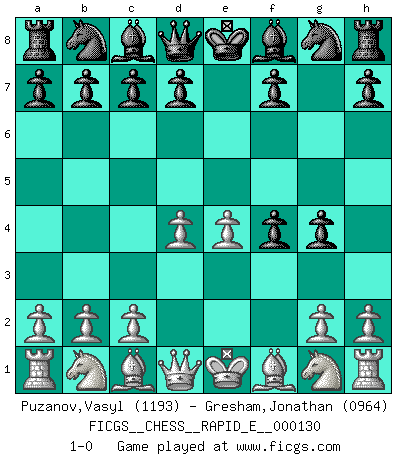 Last move : 1-0 2014 August 7 15:38:23 [Event "FICGS__CHESS__RAPID_E__000130"] [Site "FICGS"] [Date "2014.05.27"] [Round "1"] [White "Puzanov,Vasyl"] [Black "Gresham,Jonathan"] [Result "1-0"] [WhiteElo "1193"] [BlackElo "0964"] 1.e4 e5 2.f4 exf4 3.Nf3 g5 4.d4 g4 5.Ng1 1-0 This chess game has been lost on time (started : 2014.05.27 16:44:35) KGA : Rosentreter gambit Player White won this chess game. Follow this game move after move (download)Pawns: they are the soul of this game, they alone form the attack and defense. (Philidor) Ein bischen Romantik kann weder im Schach noch in der Liebe schaden. Also versuche ich mich ab und zu daran zu erinnern. (Nigel Short) No es una movida, aún la mejor movida que tu debas buscar, sino un plan comprensible. (Eugene Znosko-Borovsky) Le génie consiste à savoir transgresser les règles au moment opportun. (Teichmann) There is no vagueness without wind. (Chinese proverb)