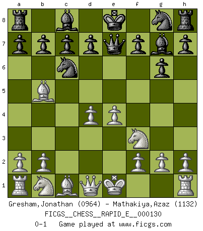 Last move : 0-1 2014 July 29 14:8:10 [Event "FICGS__CHESS__RAPID_E__000130"] [Site "FICGS"] [Date "2014.05.27"] [Round "1"] [White "Gresham,Jonathan"] [Black "Mathakiya,Azaz"] [Result "0-1"] [WhiteElo "0964"] [BlackElo "1132"] 1.e4 e5 2.Nf3 Nc6 3.Bb5 g6 4.c3 Bg7 5.d4 exd4 6.cxd4 Qe7 0-1 This chess game has been lost on time (started : 2014.05.27 16:44:35) Ruy Lopez : Fianchetto (Smyslov/Barnes) defense Player Black won this chess game. Follow this game move after move (download)Chess problems demand from the composer the same virtues that characterize all worthwhile art: originality, invention, conciseness, harmony, complexity, and splendid insincerity. (Vladimir Nabokov) Ich würde mich als ganz normalen Jungen bezeichnen [Im Alter von 12]. (Sergej Karjakin) Coloca el contenido del tablero de Ajedrez en un sombrero, agita las piezas vigorosamente, derrámalas en el tablero desde una altura de medio metro y así obtienes el estilo de Wilhelm Steinitz. (H. E. Bird) Même un GMI sait rarement calculer sur plus de cinq coups une attaque à sacrifices. (Rudolf Spielmann) Train yourself to let go of everything you fear to lose. (Master Yoda in Star Wars ep.3)