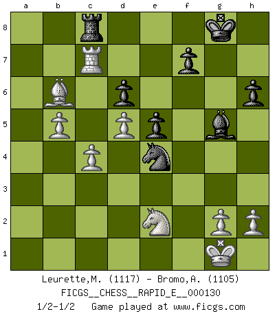 Last move : 1/2-1/2 2014 July 23 22:41:57 [Event "FICGS__CHESS__RAPID_E__000130"] [Site "FICGS"] [Date "2014.05.27"] [Round "1"] [White "Leurette,Marc-Antoine"] [Black "Bromo,Alexis"] [Result "1/2-1/2"] [WhiteElo "1117"] [BlackElo "1105"] 1.e4 e5 2.Nf3 Nc6 3.Bc4 h6 4.d4 Nf6 5.d5 Na5 6.Qd3 d6 7.O-O Be7 8.b4 Nxc4 9.Qxc4 Bd7 10.b5 b6 11.a4 O-O 12.Nc3 Rc8 13.Be3 Bg4 14.Qe2 Bxf3 15.Qxf3 Ra8 16.Ne2 Nd7 17.c4 a6 18.Qg3 axb5 19.axb5 Rxa1 20.Rxa1 Nf6 21.f3 Qd7 22.Ra7 Nh5 23.Qg4 Qxg4 24.fxg4 Nf6 25.g5 Nxe4 26.gxh6 gxh6 27.Rxc7 Bg5 28.Bxb6 Ra8 29.Ra7 Rc8 30.Rc7 Ra8 31.Ra7 Rc8 32.Rc7 1/2-1/2 King's pawn game Kingside Castling by player White (move 7) Kingside Castling by player Black (move 11) This chess game ended in a draw. Follow this game move after move (download)Why must I lose to this idiot ? (Aron Nimzovich) Der Freibauer hat für mich eine Seele, genau wie der Mensch, Wünsche, die unerkannt in ihm schlummern, und Befürchtungen, von deren Existenz er selbst kaum ahnt. (Aaron Nimzowitsch) Cuando estes solo, cuando te sientas un extraño en el mundo, juega al Ajedrez. Esto levantará tu espiritu y será tu consejero de guerra. (Aristóteles) Je ne crois pas en la psychologie, je crois aux bons coups. (Robert Fischer) Two beer, or not two beer. (Unknown)