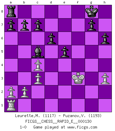Last move : 1-0 2014 August 16 0:15:52 [Event "FICGS__CHESS__RAPID_E__000130"] [Site "FICGS"] [Date "2014.05.27"] [Round "1"] [White "Leurette,Marc-Antoine"] [Black "Puzanov,Vasyl"] [Result "1-0"] [WhiteElo "1117"] [BlackElo "1193"] 1.e4 e5 2.Nf3 Nc6 3.Bc4 Bc5 4.O-O Nf6 5.Nc3 O-O 6.d3 d6 7.Bg5 h6 8.Bxf6 Qxf6 9.h3 Qg6 10.Nh4 Qg3 11.Qh5 Bxh3 12.Ne2 Qg4 13.Ng3 Qxg3 14.Qf3 Qxh4 15.Qxh3 Qxh3 16.gxh3 Nd4 17.c3 Nf3+ 18.Kg2 Nd2 19.Rfd1 Nxc4 20.dxc4 f5 21.f3 fxe4 22.Rf1 exf3+ 23.Rxf3 Rxf3 24.Kxf3 1-0 Giuoco Piano Kingside Castling by player White (move 4) Kingside Castling by player Black (move 5) Player White won this chess game. Follow this game move after move (download)No Chess Grandmaster is normal; they only differ in the extent of their madness. (Viktor Korchnoi) Ein Gewinn durch eine ungenaue Kombination, sei sie auch noch so vorzeigbar, erfüllt mich mit Schaudern. (Wilhelm Steinitz) No hay otro maestro que tenga una voluntad terrífica de ganar. Al tablero, el irradía peligro y aún los oponentes mas fuertes tienden a congelarse como liebres cuando olfatean a una pantera. Aún sus debilidades son peligrosas. Con las blancas, su juego de apertura es predecible - te es posible hacer planes en su contra - pero es tan fuerte que tus planes casi nunca funcionan. En el juego medio, su precisión e invención son fabulosas y en finales, tú simplemente no le puedes vencer. (Experto Alemán anónimo) On croit qu'il y a plus de mauvais joueurs que de bons joueurs, c'est faux : Il y a autant de joueurs qui gagnent que de joueurs qui perdent. (Philippe Geluck) Strategy without tactics is the slowest route to victory. Tactics without strategy is the noise before defeat. (Sun Tzu)
