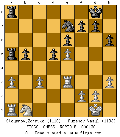 Last move : 1-0 2014 July 29 19:49:22 [Event "FICGS__CHESS__RAPID_E__000130"] [Site "FICGS"] [Date "2014.05.27"] [Round "1"] [White "Stoyanov,Zdravko"] [Black "Puzanov,Vasyl"] [Result "1-0"] [WhiteElo "1110"] [BlackElo "1193"] 1.e4 d5 2.e5 Bf5 3.d4 e6 4.h3 h6 5.Nf3 c5 6.dxc5 Bxc5 7.Bb5+ Nc6 8.Bxc6+ bxc6 9.a3 Qb6 10.Qe2 Qb5 11.Qxb5 cxb5 12.b4 Bb6 13.c3 Ne7 14.O-O O-O 15.Re1 Rfc8 16.Be3 Bxe3 17.Rxe3 Be4 18.Nbd2 Bxf3 19.Nxf3 a5 20.bxa5 Rxa5 21.Nd2 Rca8 22.Nb1 1-0 Scandinavian (centre counter) defense Kingside Castling by player White (move 14) Kingside Castling by player Black (move 14) Player White won this chess game. Follow this game move after move (download)Dazzling combinations are for the many, shifting wood is for the few. (Georg Kieninger) Schach ist das Spiel, das die Verrückten gesund hält. (Albert Einstein) Si pudieramos observar el interior de la cabeza de un jugador de Ajedrez, encontraríamos ahí un mundo lleno de sentimientos, imágenes, ideas, emoción y pasión. (Alfred Binet) Il n'y a pas eu de défaite parce que je ne crois pas que cet ordinateur ait jamais existé. IBM a triché en refusant d'imprimer les modes de recherche de la machine. C'est évident, pendant le match, des coups décisifs ont été joués par des êtres humains. Aujourd'hui, les meilleurs spécialistes en informatique ne peuvent toujours pas expliquer comment Deep-Blue a pu jouer contre la logique des ordinateurs. IBM a gagné une guerre de communication, mais ils sont incapables de prouver que l'ordinateur a gagné tout seul. (Garry Kasparov) How many people work in NATO Headquarters ? - About half of them. (Dirk Stikker, NATO general secretary)
