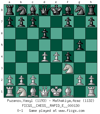 Last move : 0-1 2014 July 7 19:35:58 [Event "FICGS__CHESS__RAPID_E__000130"] [Site "FICGS"] [Date "2014.05.27"] [Round "1"] [White "Puzanov,Vasyl"] [Black "Mathakiya,Azaz"] [Result "0-1"] [WhiteElo "1193"] [BlackElo "1132"] 1.e4 e5 2.f4 exf4 3.Nf3 g5 4.d4 d6 0-1 KGA : Rosentreter gambit Player Black won this chess game. Follow this game move after move (download)If your opponent cannot do anything active, then don't rush the position; instead you should let him sit there, suffer, and beg you for a draw. (Jeremy Silman) Die Elozahlen sind sehr schlecht für das Schach. Jetzt ist Schach eine Sportindustrie, die darauf zielt Elopunkte zu machen. (Miguel Najdorf) En la perfecta combinación de Ajedrez como en una historia corta de primera clase, toda la trama y contra trama deberá conducir hacia un final sorprendente, el interes no es mitigado hasta el último momento. (Yates and Winter) J'apprécie les joueurs d'est-indienne, c'est grâce à eux que je nourris ma famille depuis tant d'années. (Petrosian) It is not true that people stop pursuing dreams because they grow old, they grow old because they stop pursuing dreams. (Gabriel Garcia Marquez)