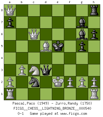 Last move : 0-1 2014 May 28 4:0:16 [Event "FICGS__CHESS__LIGHTNING_BRONZE__000540"] [Site "FICGS"] [Date "2014.05.28"] [Round "1"] [White "Pascal,Paco"] [Black "Zurro,Randy"] [Result "0-1"] [WhiteElo "1949"] [BlackElo "1750"] 1.e4 e5 2.Nf3 h6 3.Nxe5 d5 4.exd5 Qd6 5.d4 Bf5 6.Bf4 g5 7.Nxf7 Qe7+ 8.Qe2 Kxf7 9.Be5 Bg7 10.Qh5+ Bg6 11.Qf3+ Nf6 12.d6 Qe6 13.dxc7 Nc6 14.b3 Nxd4 15.Qxb7 Qxe5+ 16.Kd2 Nxc2 17.c8Q Qe7 18.Bc4+ Nd5 19.Bxd5+ Kf6 20.Qb7c6+ Ke5 21.Qc8xa8 Qb4+ 22.Nc3 Qd4+ 23.Ke2 Qd3+ 0-1 King's knight Opening Promotion Queen by player White (move 17) Player Black won this chess game. Follow this game move after move (download)Chess is no whit inferior to the violin, and we have a large number of professional violinists. (Mikhail Botvinnik) Im Reiche der Wirklichkeit ist man nie so glücklich wie im Reiche der Gedanken. (Arthur Schopenhauer) Siempre es mejor sacrificar los hombres de tu oponente. (Savielly Tartakower) Le thème de l'attaque double intervient d'une manière ou d'une autre dans l'immense majorité des combinaisons. (Youri Averbakh) Experience is the name we all give to our mistakes. (Oscar Wilde)