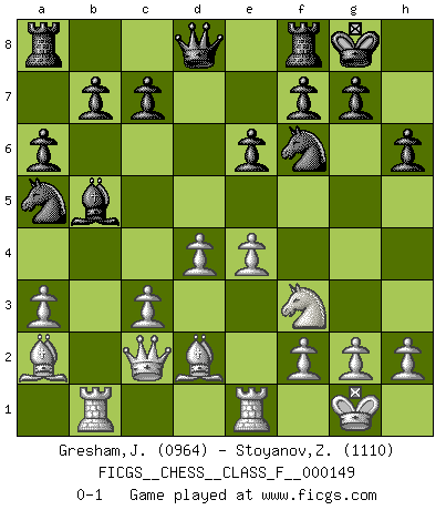 Last move : 0-1 2014 August 22 5:35:53 [Event "FICGS__CHESS__CLASS_F__000149"] [Site "FICGS"] [Date "2014.05.30"] [Round "1"] [White "Gresham,Jonathan"] [Black "Stoyanov,Zdravko"] [Result "0-1"] [WhiteElo "0964"] [BlackElo "1110"] 1.d4 d5 2.c4 dxc4 3.e3 Bd7 4.Bxc4 e6 5.Bd2 Nc6 6.Nf3 h6 7.O-O Nf6 8.Qc2 Bd6 9.e4 Bb4 10.Nc3 O-O 11.a3 Ba5 12.Rfe1 Bxc3 13.bxc3 a6 14.Rab1 Na5 15.Ba2 Bb5 0-1 This chess game has been lost on time (started : 2014.05.30 0:26:12) Queen's gambit accepted Kingside Castling by player White (move 7) Kingside Castling by player Black (move 10) Player Black won this chess game. Follow this game move after move (download)At this time Fischer is simply a level above all the best Chessplayers in the world. (John Jacobs) Vom Schach wurde gesagt das Leben sei dafür nicht lange genug. Aber das ist der Fehler des Lebens, nicht des Schach'. (Irving Chernev) Una buena ofensiva y una buena defensa, comienzan ambas con un buen desarrollo. (Bruce A. Moon) La solitude du joueur d'Echecs à l'approche du mat est semblable à celle du condamné. (Francis Szpiner) Whatever you do, don't be bored. This is absolutely the most exciting time we could have possibly hoped to be alive. And things are just starting. (From movie Waking life)