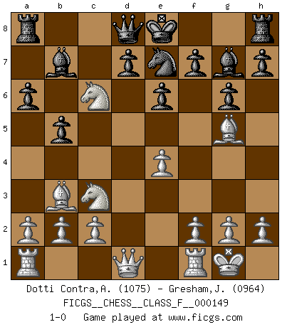 Last move : 1-0 2014 August 25 5:43:33 [Event "FICGS__CHESS__CLASS_F__000149"] [Site "FICGS"] [Date "2014.05.30"] [Round "1"] [White "Dotti Contra,Alessandro"] [Black "Gresham,Jonathan"] [Result "1-0"] [WhiteElo "1075"] [BlackElo "0964"] 1.e4 c5 2.Nf3 Nc6 3.Nc3 e6 4.d4 cxd4 5.Nxd4 Nge7 6.Bb5 a6 7.Ba4 b5 8.Bb3 Bb7 9.O-O g6 10.Bg5 Bg7 11.Nxc6 1-0 Sicilian defense Kingside Castling by player White (move 9) Player White won this chess game. Follow this game move after move (download)The Chess pieces are the block alphabet which shapes thoughts; and these thoughts, although making a visual design on the chessboard, express their beauty abstractly, like a poem. (Marcel Duchamp) Ich bin es gewohnt, das die Jugend mir überhaupt keinen Respekt entgegenbringt. (Alexander Morozewich) El tablero es el mundo, las piezas es el fenomeno del universo, las reglas del juego son lo que llamamos leyes de la naturaleza y el jugador del lado opuesto, se encuentra oculto a nuestra vista. (Thomas Huxley) La tactique, c'est ce que vous faites quand il y a quelque chose à faire; la stratégie, c'est ce que vous faites quand il n'y a rien à faire. (Savielli Tartacower) Life is painting a picture, not doing a sum. (Oliver Wendell Holmes, Jr.)