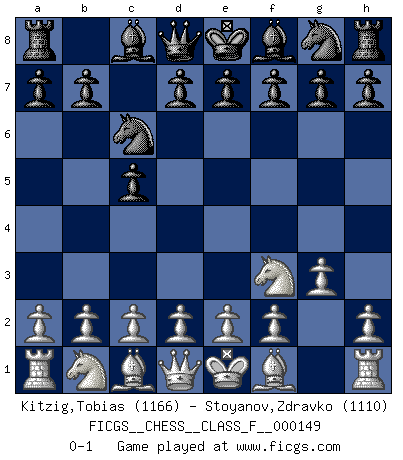 Last move : 0-1 2014 July 10 0:32:7 [Event "FICGS__CHESS__CLASS_F__000149"] [Site "FICGS"] [Date "2014.05.30"] [Round "1"] [White "Kitzig,Tobias"] [Black "Stoyanov,Zdravko"] [Result "0-1"] [WhiteElo "1166"] [BlackElo "1110"] 1.Nf3 c5 2.g3 Nc6 0-1 This chess game has been lost on time (started : 2014.05.30 0:26:12) Reti Opening Player Black won this chess game. Follow this game move after move (download)The game of Chess is not merely an idle amusement; several very valuable qualities of the mind are to be acquired and strengthened by it, so as to become habits ready on all occasions; for life is a kind of Chess. (Benjamin Franklin) Im Fernschach kannst du während dem Spiel rauchen. (John Christen Knudsen) Es muy difícil jugar en contra de la teoría de Einstein. - en su primera derrota en contra de Fischer (Mikhail Tal) Je ne crois pas en la psychologie, je crois aux bons coups. (Robert Fischer) Men never do evil so completely and cheerfully as when they do it from religious conviction. (Blaise Pascal)