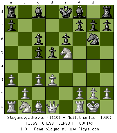 Last move : 1-0 2014 June 3 22:22:6 [Event "FICGS__CHESS__CLASS_F__000149"] [Site "FICGS"] [Date "2014.05.30"] [Round "1"] [White "Stoyanov,Zdravko"] [Black "Neil,Charlie"] [Result "1-0"] [WhiteElo "1110"] [BlackElo "1090"] 1.e4 c5 2.Nf3 Nc6 3.Bb5 e6 4.Bxc6 bxc6 5.O-O d5 6.e5 Ne7 7.a3 Ng6 8.c3 Qc7 9.d3 Qxe5 10.Nxe5 1-0 Sicilian : Nimzovich-Rossolimo attack (without ...d6) Kingside Castling by player White (move 5) Player White won this chess game. Follow this game move after move (download)If your opponent offers you a draw, try to work out why he thinks he's worse off. (Nigel Short) Wie, soll nun auch die Opposition abgeschafft werden? Ja, es tut mir leid, Ihnen diesen Schmerz nicht ersparen zu können. (Aaron Nimzowitsch) El Ajedrez no es una pizca de inferior al violín, y tenemos un gran número de violinistas profesionales. (Mikhail Botvinnik) La menace est plus forte que l'exécution. (Aaron Nimzovitch) There are two major products that came out of Berkeley: LSD and UNIX. We do not believe this is to be a coincidence. (Jeremy S. Anderson)