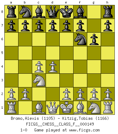 Last move : 1-0 2014 July 19 13:21:24 [Event "FICGS__CHESS__CLASS_F__000149"] [Site "FICGS"] [Date "2014.05.30"] [Round "1"] [White "Bromo,Alexis"] [Black "Kitzig,Tobias"] [Result "1-0"] [WhiteElo "1105"] [BlackElo "1166"] 1.d4 Nf6 2.c4 g6 3.Nc3 1-0 This chess game has been lost on time (started : 2014.05.30 0:26:12) King's Indian defense, 3.Nc3 Player White won this chess game. Follow this game move after move (download)By the beauty of his games, the clarity of his play, and the brilliance of his ideas, Fischer made himself an artist of the same stature as Brahms, Rembrandt, and Shakespeare. (David Levy) Die Idee von Capablanca, Schach als Fach in den Schulen zu lehren, ist großartig. (Fidel Castro) Yo creo que el Ajedrez posee una magia que es también una ayuda en la edad avanzada. Una rodilla reumática es olvidada durante una partida de Ajedrez y otros eventos pueden parecer algo sin importancia comparada a una catástrofe en el tablero de Ajedrez. (Vlastimil Hort) On a dit que l'homme se distingue de l'animal par le fait qu'il achète plus de livres qu'il ne peut en lire. Je voudrais suggérer qu'inclure à la liste des livres quelques livres d'échecs rendrait la distinction manifeste. (Edward Lasker) It's not the size of the dog in the fight, it's the size of the fight in the dog. (Mark Twain)