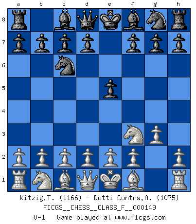 Last move : 0-1 2014 July 10 0:32:7 [Event "FICGS__CHESS__CLASS_F__000149"] [Site "FICGS"] [Date "2014.05.30"] [Round "1"] [White "Kitzig,Tobias"] [Black "Dotti Contra,Alessandro"] [Result "0-1"] [WhiteElo "1166"] [BlackElo "1075"] 1.Nf3 Nc6 2.g3 e5 0-1 This chess game has been lost on time (started : 2014.05.30 0:26:12) Reti Opening Player Black won this chess game. Follow this game move after move (download)Bobby Fischer's current state of mind is indeed a tragedy. One of the world's greatest Chess players - the pride and sorrow of American Chess. (Frank Brady) Man gibt nur Pakete auf. (Paul Keres) Nunca nadie ha ganado una partida de Ajedrez rindiendose. (Unknown) Les ravages du H expliquent la différence de niveau entre Tal et Thal [Abergel]. To send light into the darkness of men's hearts - such is the duty of the artist. (Schumann)