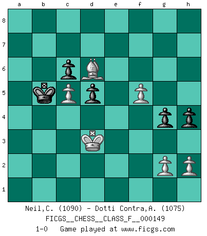 Last move : 1-0 2014 August 16 12:50:43 [Event "FICGS__CHESS__CLASS_F__000149"] [Site "FICGS"] [Date "2014.05.30"] [Round "1"] [White "Neil,Charlie"] [Black "Dotti Contra,Alessandro"] [Result "1-0"] [WhiteElo "1090"] [BlackElo "1075"] 1.Nf3 Nc6 2.e4 e5 3.d4 d6 4.Bb5 Bd7 5.dxe5 Nxe5 6.Bxd7+ Qxd7 7.Nc3 O-O-O 8.Be3 b6 9.O-O Nf6 10.Bf4 Nxf3+ 11.Qxf3 h6 12.a3 Be7 13.Rfd1 Qc6 14.Qd3 Qb7 15.Qc4 Rhf8 16.Nb5 Rd7 17.Nd4 Nxe4 18.Nc6 Nc5 19.Nxe7+ Rxe7 20.b4 b5 21.Qc3 Rg8 22.bxc5 d5 23.Rab1 Qc6 24.Qb4 a6 25.f3 Rd7 26.a4 Rgd8 27.axb5 Qxb5 28.Qxb5 axb5 29.Ra1 Kb7 30.Rd4 c6 31.Rb1 g5 32.Bd6 Ra8 33.Rdb4 f5 34.Kf2 f4 35.c3 Rf7 36.R4b2 Ra5 37.Re2 Ra8 38.Re7+ Rxe7 39.Bxe7 Rg8 40.Re1 Re8 41.Bf6 Rxe1 42.Kxe1 Ka6 43.Kd2 Ka5 44.Kd3 Ka4 45.Bg7 h5 46.Bh6 g4 47.Bxf4 b4 48.cxb4 Kxb4 49.Bd6 Kb5 50.f4 h4 51.f5 1-0 Reti Opening Queenside Castling by player Black (move 7) Kingside Castling by player White (move 9) Player White won this chess game. Follow this game move after move (download)One doesn't have to play well, it's enough to play better than your opponent. (Siegbert Tarrasch) Ich verlor meine Bürgerrechte, mein Gehalt wurde mir nicht mehr bezahlt und ich wurde zensiert und durfte nicht mehr ins Ausland reisen. [nach dem Match Fischer-Taimanov 6:0] (Mark Taimanov) No solamente yo pronostico su triunfo sobre Botvinnik, sino que me adelanto y digo que probablemente Fischer es el jugador de Ajedrez mas grande que haya existido. (John Collins) Le thème de l'attaque double intervient d'une manière ou d'une autre dans l'immense majorité des combinaisons. (Youri Averbakh) A good aphorism is too hard for the tooth of time, and is not worn away with the centuries, although it serves as food for every speech. (Friedrich Nietzsche)