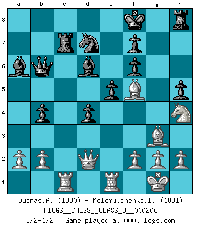Last move : 1/2-1/2 2014 July 14 10:11:11 [Event "FICGS__CHESS__CLASS_B__000206"] [Site "FICGS"] [Date "2014.05.30"] [Round "1"] [White "Duenas,Alexis"] [Black "Kolomytchenko,Igor"] [Result "1/2-1/2"] [WhiteElo "1890"] [BlackElo "1891"] 1.d4 d5 2.c4 c6 3.Nc3 Nf6 4.e3 e6 5.Nf3 Nbd7 6.Bd3 dxc4 7.Bxc4 b5 8.Bd3 a6 9.e4 c5 10.e5 cxd4 11.Nxb5 axb5 12.exf6 gxf6 13.O-O Qb6 14.Qe2 b4 15.Bf4 Bc5 16.Rfd1 Bb7 17.Be4 Ba6 18.Qd2 Ra7 19.Bg3 h5 20.Rac1 e5 21.Bf5 Kf8 22.Re1 Rc7 23.Nh4 Bd6 1/2-1/2 QGD Slav defense Kingside Castling by player White (move 13) This chess game ended in a draw. Follow this game move after move (download)It is no time to be playing Chess when the house is on fire. (Italian Proverb) Die Partien sind immer verschieden, die Interviews immer die gleichen. (Garry Kasparov) Cuando me preguntan: -¿Cual es el secreto que te hace hacer mejores movidas que tus oponentes?, Yo respondo: Me da gusto que me pregunten eso, porque, como veran, hay una simple razón. Yo pienso mis propias movidas y dejo a mi oponente que el piense las suyas. (Alexander Alekhine) Les sacrifices démontrent seulement que quelqu'un a gaffé. (Savielly Tartacover) A good player is always lucky. (Capablanca)