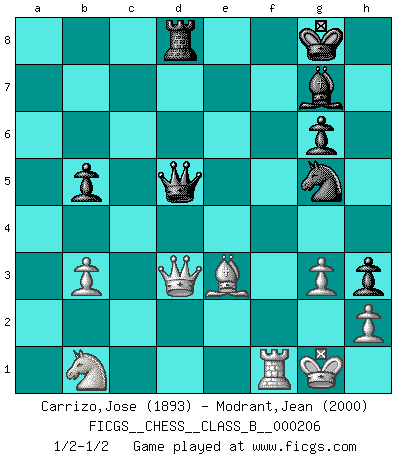 Last move : 1/2-1/2 2014 October 30 22:20:34 [Event "FICGS__CHESS__CLASS_B__000206"] [Site "FICGS"] [Date "2014.05.30"] [Round "1"] [White "Carrizo,Jose"] [Black "Modrant,Jean"] [Result "1/2-1/2"] [WhiteElo "1893"] [BlackElo "2000"] 1.e4 c5 2.Nf3 d6 3.d4 cxd4 4.Nxd4 Nf6 5.Nc3 a6 6.Be3 e5 7.Nb3 Be6 8.f3 h5 9.Nd5 Bxd5 10.exd5 Nbd7 11.Qd2 g6 12.Be2 Bg7 13.O-O b6 14.c4 O-O 15.Bd3 h4 16.Bg5 h3 17.g3 Rb8 18.Rac1 a5 19.Qe2 Nc5 20.Nd2 Qd7 21.b3 Nh7 22.Be3 Nxd3 23.Qxd3 f5 24.Rcd1 a4 25.Nb1 b5 26.c5 dxc5 27.Bxc5 e4 28.fxe4 fxe4 29.Qxe4 Ng5 30.Qd3 Rxf1+ 31.Rxf1 axb3 32.axb3 Rd8 33.Be3 Qxd5 1/2-1/2 Sicilian : Najdorf, Byrne (English) attack Kingside Castling by player White (move 13) Kingside Castling by player Black (move 14) This chess game ended in a draw. Follow this game move after move (download)The passed pawn is a criminal, who should be kept under lock and key. Mild measures, such as police surveillance, are not sufficient. (Nimzovitch) Es ist peinlich, dass ich nie Weltmeister wurde. Es wäre leicht, Leonid Breschnjew als Ursache vorzuschieben, dessen Apparat den Vorzeigekommunisten Anatoli Karpow in allem unterstützte. Aber Garri Kasparow zum Beispiel, der ebenfalls von den Sowjets unerwünscht war, hat trotz der Widerstände den WM-Titel erobert. (Viktor Kortschnoi) No todos los artistas son jugadores de Ajedrez, pero todos los jugadores de Ajedrez son artistas. (Marcel Duchamp) Karpov est une pièce de musée. (Garry Kasparov) There's always a bigger fish. (Qui-Gon Jinn in Star Wars ep.1)