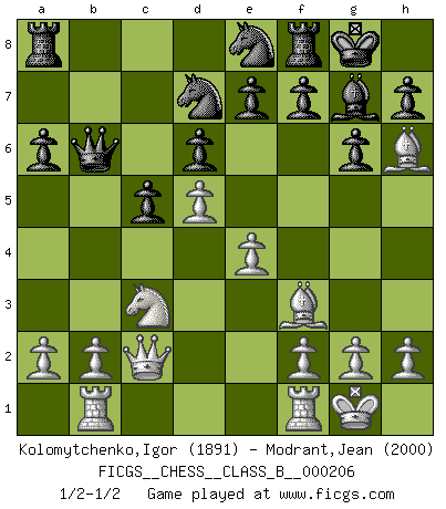 Last move : 1/2-1/2 2014 July 25 4:20:47 [Event "FICGS__CHESS__CLASS_B__000206"] [Site "FICGS"] [Date "2014.05.30"] [Round "1"] [White "Kolomytchenko,Igor"] [Black "Modrant,Jean"] [Result "1/2-1/2"] [WhiteElo "1891"] [BlackElo "2000"] 1.d4 Nf6 2.c4 c5 3.d5 b5 4.cxb5 a6 5.b6 g6 6.Nc3 Bg7 7.Nf3 d6 8.e4 Qxb6 9.Qc2 O-O 10.Be2 Bg4 11.O-O Nbd7 12.Rb1 Ne8 13.Be3 Bxf3 14.Bxf3 Bd4 15.Bh6 Bg7 16.Be3 Bd4 17.Bh6 Bg7 1/2-1/2 Benko gambit half accepted Kingside Castling by player Black (move 9) Kingside Castling by player White (move 11) This chess game ended in a draw. Follow this game move after move (download)After black's reply to 1.e4 with 1..e5, leaves him always trying to get into the game. (Howard Staunton) Obwohl ich vom Stil her kaum zu den Priestern der Schachkunst gezählt werde, halte ich Schach doch für eine Kunst. (Tigran Petrosjan) Nunca nadie ha ganado una partida de Ajedrez rindiendose. (Unknown) La menace est plus forte que l'exécution. (Aaron Nimzovitch) The absolute truth is the thing that makes people laugh. (Carl Reiner)