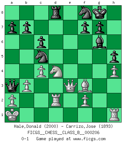 Last move : 0-1 2014 December 13 1:36:15 [Event "FICGS__CHESS__CLASS_B__000206"] [Site "FICGS"] [Date "2014.05.30"] [Round "1"] [White "Hale,Donald"] [Black "Carrizo,Jose"] [Result "0-1"] [WhiteElo "2000"] [BlackElo "1893"] 1.d4 d5 2.c4 e6 3.Nc3 c6 4.e4 dxe4 5.Nxe4 Bb4+ 6.Bd2 Qxd4 7.Bxb4 Qxe4+ 8.Be2 Na6 9.Bd6 Qxg2 10.Qd2 Nf6 11.Bf3 Qg6 12.Ne2 e5 13.Bxe5 Be6 14.O-O-O Qf5 15.Bf4 Qc5 16.b3 Qa3+ 17.Kb1 Bf5+ 18.Ka1 O-O 19.Bd6 Nc5 20.Qe3 Nfd7 21.Bxf8 Nxf8 22.Nd4 Bg6 23.h4 h5 24.Rd2 Rd8 0-1 This chess game has been lost on time (started : 2014.05.30 3:53:36) QGD : Semi-Slav, Marshall gambit Queenside Castling by player White (move 14) Kingside Castling by player Black (move 18) Player Black won this chess game. Follow this game move after move (download)The laws of Chess do not permit a free choice: you have to move whether you like it or not. (Emanuel Lasker) Der Traum, für den ich lebe, ist der von einem freien Russland. Viele mögen sagen: Russland hat doch ein Parlament, einen gewählten Präsidenten. Aber ich spüre, dass in meiner Heimat die Angst wiederkehrt. Eine Angst, sich frei zu äußern, bestimmte Dinge zu tun (Garry Kasparov) Yo jugué Ajedrez con el y a veces le pude haber ganado solo que siempre devuelve su última jugada y juega la partida de manera diferente. (Mark Twain) Les Echecs mettent en conflit, non pas deux intelligences, mais deux volontés. (Lasker) Optimism is a variety of information deficit. Sometimes especially true for correspondence chess games. (Michael Aigner)