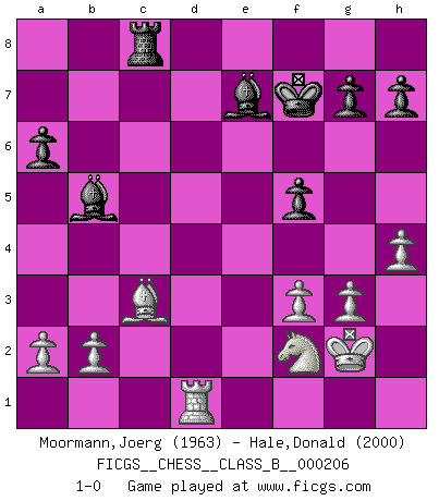 Last move : 1-0 2014 December 15 13:47:8 [Event "FICGS__CHESS__CLASS_B__000206"] [Site "FICGS"] [Date "2014.05.30"] [Round "1"] [White "Moormann,Joerg"] [Black "Hale,Donald"] [Result "1-0"] [WhiteElo "1963"] [BlackElo "2000"] 1.e4 e5 2.Nf3 Nc6 3.Bb5 a6 4.Ba4 Nf6 5.O-O Be7 6.Re1 b5 7.Bb3 O-O 8.c3 d5 9.exd5 Nxd5 10.Nxe5 Nxe5 11.Rxe5 c6 12.d3 Bd6 13.Re1 Bf5 14.Qf3 Qh4 15.g3 Qh3 16.Bxd5 cxd5 17.Qxd5 Rad8 18.Qg2 Qxg2+ 19.Kxg2 Bxd3 20.Be3 Rfe8 21.Nd2 b4 22.Bb6 Rc8 23.Ba5 bxc3 24.Bxc3 f6 25.f3 Kf7 26.Ne4 Be7 27.Red1 Red8 28.Rac1 f5 29.Nf2 Bb5 30.h4 Rxd1 31.Rxd1 1-0 Ruy Lopez : Closed, 7...O-O Kingside Castling by player White (move 5) Kingside Castling by player Black (move 7) Player White won this chess game. Follow this game move after move (download)I am still a victim of Chess. It has all the beauty of art and much more. It cannot be commercialized. Chess is much purer than art in its social position. (Marcel Duchamp) Die FIDE ist dabei in die Hände der russischen Mafia zu fallen. (Larry Evans) No es tiempo de jugar al Ajedrez cuando la casa esta en llamas. (Proverbio Italiano) Nous vivons dans un monde échiquéen : chaque jour qui passe est un défi à relever. (Philosophe Sasha) Art is the triumph over chaos. (John Cheever)