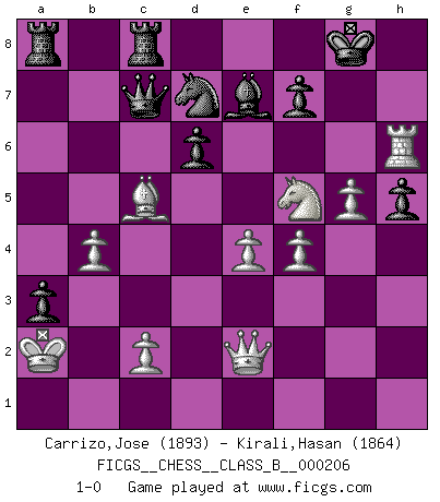 Last move : 1-0 2014 December 24 12:9:53 [Event "FICGS__CHESS__CLASS_B__000206"] [Site "FICGS"] [Date "2014.05.30"] [Round "1"] [White "Carrizo,Jose"] [Black "Kirali,Hasan"] [Result "1-0"] [WhiteElo "1893"] [BlackElo "1864"] 1.e4 c5 2.Nf3 d6 3.d4 cxd4 4.Nxd4 Nf6 5.Nc3 a6 6.Be3 e5 7.Nb3 Be6 8.f3 Be7 9.Qd2 O-O 10.O-O-O Nbd7 11.g4 b5 12.g5 b4 13.Ne2 Ne8 14.f4 g6 15.h4 a5 16.h5 a4 17.Nbd4 b3 18.Kb1 exd4 19.Nxd4 Bg4 20.hxg6 hxg6 21.Be2 Bxe2 22.Qxe2 Ng7 23.Rh6 Nh5 24.Rh1 bxa2+ 25.Kxa2 a3 26.b4 Qc7 27.R1xh5 gxh5 28.Nf5 Rfc8 29.Bc5 1-0 Sicilian : Najdorf, Byrne (English) attack Kingside Castling by player Black (move 9) Queenside Castling by player White (move 10) Player White won this chess game. Follow this game move after move (download)The combination player thinks forward; he starts from the given position, and tries the forceful moves in his mind. (Emanuel Lasker) Wenn du gegen Bobby spielst, ist es keine Frage von gewinnen oder verlieren. Es ist eine Frage des Überlebens. (Boris Vassilievich Spassky) Existen dos clases de sacrificios: los correctos y los míos. (Mikhail Tal) L'attaque fait le spectacle, la défense gagne les matchs. (Dicton footballistique) I've lost money so fast in these clubs it's left me reeling. I've read every poker book ever written, but the only way to get better at the game is to go out and play with people who are really good. The problem is, you stand to lose a lot of money doing it. (Matt Damon)