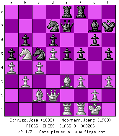 Last move : 1/2-1/2 2014 October 2 23:21:46 [Event "FICGS__CHESS__CLASS_B__000206"] [Site "FICGS"] [Date "2014.05.30"] [Round "1"] [White "Carrizo,Jose"] [Black "Moormann,Joerg"] [Result "1/2-1/2"] [WhiteElo "1893"] [BlackElo "1963"] 1.e4 c5 2.Nf3 d6 3.d4 cxd4 4.Nxd4 Nf6 5.Nc3 a6 6.Be3 e5 7.Nb3 Be6 8.f3 h5 9.Nd5 Bxd5 10.exd5 Nbd7 11.Qd2 Qc7 12.c4 a5 13.a4 b6 14.Bd3 g6 15.O-O Bg7 16.Rae1 O-O 17.Nc1 Rae8 18.b3 Nc5 19.Bc2 Nfd7 20.Ne2 Qd8 21.Nc3 f5 22.Nb5 Qe7 23.h3 Kh7 1/2-1/2 Sicilian : Najdorf, Byrne (English) attack Kingside Castling by player White (move 15) Kingside Castling by player Black (move 16) This chess game ended in a draw. Follow this game move after move (download)Strategy requires thought, tactics require observation. (Max Euwe) Immer nach dem besten Zug zu suchen ist ziemlich unpraktisch. (Nigel Short) El Ajedrez, como cualquier actividad creativa, solo puede existir a través del esfuerzo combinado de aquellos que tienen talento creativo y de aquellos que poseen la habilidad de organizar su trabajo creativo. (Mikhail Botvinnik) La tactique est l'élément le plus important du milieu de jeu. (Siegbert Tarrasch) Control your own destiny or someone else will. (Jack Welch)