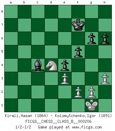 Last move : 1/2-1/2 2015 February 17 12:34:14 [Event "FICGS__CHESS__CLASS_B__000206"] [Site "FICGS"] [Date "2014.05.30"] [Round "1"] [White "Kirali,Hasan"] [Black "Kolomytchenko,Igor"] [Result "1/2-1/2"] [WhiteElo "1864"] [BlackElo "1891"] 1.d4 d5 2.c4 c6 3.Nf3 Nf6 4.Nc3 e6 5.e3 Nbd7 6.Qc2 Bd6 7.Be2 O-O 8.b3 b6 9.O-O Bb7 10.Bb2 Qe7 11.Rad1 h6 12.Rfe1 Rfd8 13.Bd3 Rac8 14.a3 c5 15.Qe2 Bb8 16.cxd5 exd5 17.dxc5 bxc5 18.h3 Re8 19.Bf5 g6 20.Bxd7 Qxd7 21.Qd3 Qc7 22.Nb5 Qb6 23.Ba1 Ne4 24.Nc3 c4 25.Nxe4 dxe4 26.Qc3 f6 27.Nd4 cxb3 28.Qxb3+ Qxb3 29.Nxb3 Kf7 30.Bd4 f5 31.Rb1 Re7 32.Rec1 Rxc1+ 33.Nxc1 Bd6 34.Bxa7 Bxa3 35.Bd4 Bd5 36.Rb5 Bc4 37.Rb6 Rc7 38.Na2 Bc5 39.Bxc5 Rxc5 40.Nb4 Rb5 41.Rxb5 Bxb5 42.Nc2 Bd3 43.Nd4 Bc4 1/2-1/2 QGD Slav : 4.Nc3 Kingside Castling by player Black (move 7) Kingside Castling by player White (move 9) This chess game ended in a draw. Follow this game move after move (download)Weak points or holes in the opponent's position must be occupied by pieces not Pawns. (Siegbert Tarrasch) Ich habe Putins Aufstieg an die Macht beobachtet und seine Politik, die demokratischen Institutionen meines Landes zu zerstören. (Garry Kasparov) Los finales de Peón son del Ajedrez lo que el cesped es del Golf. (Cecil Purdy) Celui qui prend des risques peut perdre, celui qui n'en prend pas perd toujours. (Xavier Tartacover) A good programmer is someone who always looks both ways before crossing a one-way street. (Doug Linder)