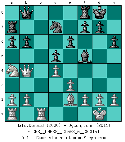 Last move : 0-1 2014 September 27 20:33:23 [Event "FICGS__CHESS__CLASS_A__000151"] [Site "FICGS"] [Date "2014.05.31"] [Round "1"] [White "Hale,Donald"] [Black "Dyson,John"] [Result "0-1"] [WhiteElo "2000"] [BlackElo "2011"] 1.d4 d5 2.c4 c6 3.Nc3 Nf6 4.e3 a6 5.Nf3 Bf5 6.Qb3 Ra7 7.cxd5 cxd5 8.Ne5 e6 9.Be2 h6 10.Bd2 Be7 11.O-O O-O 12.Rfc1 Nbd7 13.Nxd7 Nxd7 14.Na4 b6 15.Bb4 Bxb4 16.Qxb4 Qb8 0-1 This chess game has been lost on time (started : 2014.05.31 14:22:51) QGD Slav defense Kingside Castling by player White (move 11) Kingside Castling by player Black (move 11) Player Black won this chess game. Follow this game move after move (download)Half the variations which are calculated in a tournament game turn out to be completely superfluous. Unfortunately, no one knows in advance which half. (Jan Tinman) Im Wettkampf zwischen starken Meistern kommen Fehler sehr selten vor, deshalb ist es mit bloßem Warten nicht getan. (José Raúl Capablanca) Tu sabes que vas a perder. Aún cuando tenía la ventaja, yo sabía que iba a perder. - al estar jugando con Fischer (Andrew Soltis) Les échecs sont un jeu par leur forme, un art par leur essence et une science par sa difficulté d'acquisition. Ils peuvent vous procurer autant de plaisir qu'un bon livre ou une belle musique, mais vous n'aurez une réelle joie que si vous arrivez à bien jouer. (Tigran Petrosian) If we don't succeed, we run the risk of failure. (George W. Bush)