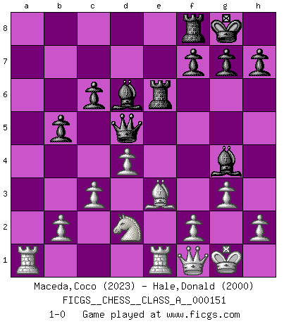 Last move : 1-0 2014 December 26 15:19:2 [Event "FICGS__CHESS__CLASS_A__000151"] [Site "FICGS"] [Date "2014.05.31"] [Round "1"] [White "Maceda,Coco"] [Black "Hale,Donald"] [Result "1-0"] [WhiteElo "2023"] [BlackElo "2000"] 1.e4 e5 2.Nf3 Nc6 3.Bb5 a6 4.Ba4 Nf6 5.O-O Be7 6.Re1 b5 7.Bb3 O-O 8.c3 d5 9.exd5 Nxd5 10.Nxe5 Nxe5 11.Rxe5 c6 12.d4 Bd6 13.Re1 Qh4 14.g3 Qh3 15.Be3 Bg4 16.Qd3 Rae8 17.Nd2 Qh5 18.a4 Re6 19.axb5 axb5 20.Bxd5 Qxd5 21.Qf1 1-0 Ruy Lopez : Closed, 7...O-O Kingside Castling by player White (move 5) Kingside Castling by player Black (move 7) Player White won this chess game. Follow this game move after move (download)Life is a kind of Chess, with struggle, competition, good and ill events. (Benjamin Franklin) Im Hotelzimmer gab es nur zwei Schaben. (Über die Turnierbedingungen) (Peter Swidler) La señal de un Gran Maestro es su habilidad de ganar una partida rápidamente y sin dolor. (Irving Chernev) Les Echecs, c'est l'art de la guerre sans les charniers, c'est la résurrection des morts tombés au champ d'honneur, l'espoir perpétuel, la suprématie de l'intelligence sur la force, la culture de l'esprit. (F. Szpiner) Fame, I have already. Now I need the money. (an elderly Steinitz)