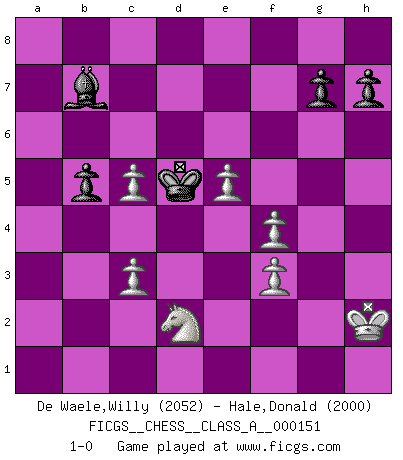 Last move : 1-0 2015 January 21 5:38:36 [Event "FICGS__CHESS__CLASS_A__000151"] [Site "FICGS"] [Date "2014.05.31"] [Round "1"] [White "De Waele,Willy"] [Black "Hale,Donald"] [Result "1-0"] [WhiteElo "2052"] [BlackElo "2000"] 1.e4 e5 2.Nf3 Nc6 3.Bb5 a6 4.Ba4 Nf6 5.O-O Be7 6.Re1 b5 7.Bb3 O-O 8.c3 d5 9.exd5 Nxd5 10.Nxe5 Nxe5 11.Rxe5 c6 12.d4 Bd6 13.Re1 Qh4 14.g3 Qh3 15.Be3 Bg4 16.Qd3 Rae8 17.Nd2 Re6 18.a4 f5 19.axb5 axb5 20.Qf1 Qh5 21.Bf4 Rxe1 22.Rxe1 Bxf4 23.gxf4 Bh3 24.Qd3 Rf6 25.Re3 Rg6+ 26.Rg3 Kf8 27.Nf3 Nxf4 28.Qe3 Ne2+ 29.Qxe2 f4 30.Bf7 Rxg3+ 31.hxg3 Qxf7 32.Ng5 Qf5 33.Qe5 Qxe5 34.dxe5 Bf5 35.gxf4 Ke7 36.Nf3 c5 37.b4 Be4 38.Nd2 Bb7 39.bxc5 Ke6 40.Kh2 Kd5 41.f3 1-0 This chess game has been lost on time (started : 2014.05.31 14:22:51) Ruy Lopez : Closed, 7...O-O Kingside Castling by player White (move 5) Kingside Castling by player Black (move 7) Player White won this chess game. Follow this game move after move (download)Chess is a matter of delicate judgment, knowing when to punch and how to duck. (Bobby Fischer) Dieses schreckliche Gefühl, dass ich gegen eine Maschine spielte, die niemals Fehler macht, zerschmetterte meinen Widerstand. (Mark Taimanov) Evita las multitudes. Haz independientemente tu propio razonamiento. Trata de ser el jugador de Ajedrez, no la pieza de Ajedrez. (Ralph Charell) Avec des compensations pour le matériel en plus... (Anonyme) The best weapon against an enemy is another enemy. (Friedrich Nietzsche)