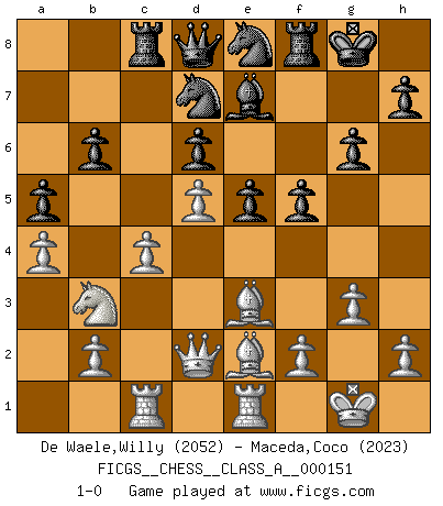 Last move : 1-0 2014 August 23 17:38:0 [Event "FICGS__CHESS__CLASS_A__000151"] [Site "FICGS"] [Date "2014.05.31"] [Round "1"] [White "De Waele,Willy"] [Black "Maceda,Coco"] [Result "1-0"] [WhiteElo "2052"] [BlackElo "2023"] 1.e4 c5 2.Nf3 d6 3.d4 cxd4 4.Nxd4 Nf6 5.Nc3 a6 6.Be3 e5 7.Nb3 Ng4 8.Bc1 Nf6 9.Be2 Be7 10.O-O O-O 11.Qd3 Be6 12.Be3 Nbd7 13.Nd5 Bxd5 14.exd5 Rc8 15.c4 Ne8 16.Qd2 f5 17.g3 g6 18.Rac1 b6 19.Rfe1 a5 20.a4 1-0 This chess game has been lost on time (started : 2014.05.31 14:22:51) Sicilian : Najdorf, Byrne (English) attack Kingside Castling by player White (move 10) Kingside Castling by player Black (move 10) Player White won this chess game. Follow this game move after move (download)You need not play well - just help your opponent to play badly. (Genrikh Chepukaitis) Ich glaube, ich kenne inzwischen die Gründe für mein Versagen: schachliche Charakterfehler. Ich war nie ein Wunderkind und in meiner gesamten menschlichen Entwicklung immer zu langsam. (Viktor Kortschnoi) Fischer es el jugador mas fuerte del mundo. De hecho, el jugador mas fuerte que jamas haya existido. (Larry Evans) Seul un grand joueur sait à quel point il joue faiblement. (Xavier Tartacover) I just play for fun. (Anna Kournikova)