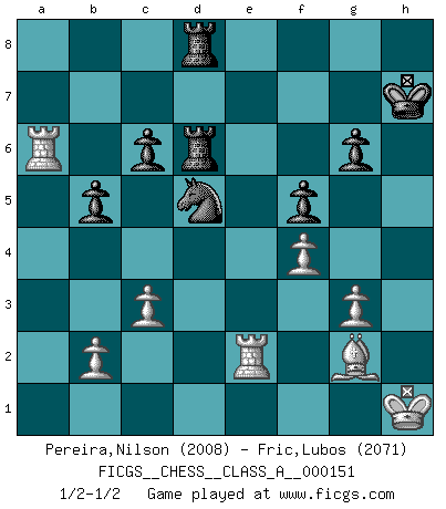 Last move : 1/2-1/2 2014 December 10 9:23:55 [Event "FICGS__CHESS__CLASS_A__000151"] [Site "FICGS"] [Date "2014.05.31"] [Round "1"] [White "Pereira,Nilson"] [Black "Fric,Lubos"] [Result "1/2-1/2"] [WhiteElo "2008"] [BlackElo "2071"] 1.e4 e5 2.Nf3 Nc6 3.Bb5 a6 4.Ba4 Nf6 5.O-O Be7 6.Re1 b5 7.Bb3 O-O 8.c3 d5 9.exd5 Nxd5 10.Nxe5 Nxe5 11.Rxe5 c6 12.d4 Bd6 13.Re1 Qh4 14.g3 Qh3 15.Be3 Bg4 16.Qd3 Rae8 17.Nd2 Qh5 18.a4 Re6 19.axb5 axb5 20.Nf1 Bf5 21.Qd2 Bh3 22.Bd1 Qg6 23.Bf3 Qf5 24.Qd1 h5 25.Ra6 Bc7 26.Bh1 Rf6 27.Qe2 Bg4 28.Qd2 Bh3 29.Bg5 Rg6 30.Bh4 Bxf1 31.Rxf1 Nf4 32.Bf3 Nh3+ 33.Kg2 Nf4+ 34.Kh1 Re6 35.Qd1 Ng6 36.g4 hxg4 37.Bxg4 Qe4+ 38.f3 Qe2 39.Bg3 Bxg3 40.hxg3 f5 41.d5 Qxd1 42.Rxd1 Rd6 43.Bh3 Ne7 44.f4 Nxd5 45.Re1 Kh7 46.Re5 g6 47.Bg2 Rfd8 48.Re2 1/2-1/2 Ruy Lopez : Closed, 7...O-O Kingside Castling by player White (move 5) Kingside Castling by player Black (move 7) This chess game ended in a draw. Follow this game move after move (download)The game of Chess is not merely an idle amusement; several very valuable qualities of the mind are to be acquired and strengthened by it, so as to become habits ready on all occasions; for life is a kind of Chess. (Benjamin Franklin) Jeder Schachmeister war einmal ein Anfänger. (Irving Chernev) Una buena memoria, concentración, imaginación y una fuerte voluntad, se requiere para llegar a ser un buen jugador. (Bobby Fischer) Le système Elo représente seulement une moyenne. Il est simplement un indicateur de votre stabilité. (Anatoli Karpov) Better than a thousand days of diligent study is one day with a great teacher. (Japanese proverb)