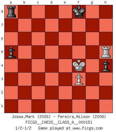 Last move : 1/2-1/2 2014 September 8 6:10:45 [Event "FICGS__CHESS__CLASS_A__000151"] [Site "FICGS"] [Date "2014.05.31"] [Round "1"] [White "Josse,Mark"] [Black "Pereira,Nilson"] [Result "1/2-1/2"] [WhiteElo "2026"] [BlackElo "2008"] 1.d4 Nf6 2.c4 e6 3.Nc3 d5 4.Bg5 Be7 5.e3 O-O 6.cxd5 exd5 7.Bd3 c6 8.Qc2 Nbd7 9.Nge2 Re8 10.O-O Nf8 11.f3 Be6 12.Rae1 Rc8 13.Kh1 N6d7 14.Bxe7 Qxe7 15.Ng3 Nf6 16.Qd2 c5 17.Nf5 Bxf5 18.Bxf5 Rcd8 19.dxc5 Qxc5 20.Qd4 Qa5 21.Re2 Ne6 22.Qd3 a6 23.a3 b5 24.Na2 Qb6 25.Rd1 Rc8 26.Qd2 g6 27.Bxe6 Rxe6 28.Nb4 Kg7 29.g4 a5 30.Nc2 Rec6 31.Nd4 Rc4 32.h4 h5 33.g5 Ne8 34.b3 R4c7 35.Kg2 Kh7 36.R2e1 Nd6 37.Qb2 Rc3 38.Rc1 Qc7 39.Rxc3 Qxc3 40.Qxc3 Rxc3 41.a4 bxa4 42.bxa4 Kg7 43.Kg3 Ra3 44.Kf4 Nc4 45.Rb1 Nxe3 46.Rb7 Ng2+ 47.Kg3 Nxh4 48.Ne6+ Kg8 49.Rb8+ Kh7 50.Rb7 Nf5+ 51.Kf4 Nd6 52.Rd7 h4 53.Nf8+ Kg8 54.Nxg6 Rxa4+ 55.Ke5 Ne8 56.Ne7+ Kf8 57.g6 Ra1 58.gxf7 Re1+ 59.Kf4 Rxe7 60.fxe8Q+ Rxe8 61.Rxd5 Ra8 62.Rh5 1/2-1/2 Queen's pawn game Kingside Castling by player Black (move 5) Kingside Castling by player White (move 10) 10 pieces endgame at move 59 : White KRPP , Black KRNPPP WHITE : King + 1 Rook 2 Pawns BLACK : King + 1 Rook 1 Knight 3 Pawns Promotion Queen by player White (move 60) 9 pieces endgame at move 60 : White KQRP , Black KRPPP WHITE : King + 1 Queen 1 Rook 1 Pawn BLACK : King + 1 Rook 3 Pawns 8 pieces endgame at move 60 : White KRP , Black KRPPP WHITE : King + 1 Rook 1 Pawn BLACK : King + 1 Rook 3 Pawns 7 pieces endgame at move 61 : White KRP , Black KRPP WHITE : King + 1 Rook 1 Pawn BLACK : King + 1 Rook 2 Pawns This chess game ended in a draw. Follow this game move after move (download)Chess is in its essence a game, in its form an art, and in its execution a science. (Baron Tassilo) Schon mancher Spieler hat aufgegeben, um zu vermeiden, daß er eine Figur verliert. (Savielly Grigorievitsch Tartakower) El Ajedrez es como la guerra en un tablero. (Bobby Fischer) Vouloir jouer aux échecs contre soi-même est aussi paradoxal que vouloir marcher sur son ombre. (Stefan Zweig) It's only after you lost everything, Tyler says, that you're free to do anything. (Chuck Palahniuk, Fight Club)