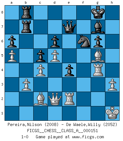 Last move : 1-0 2014 July 17 12:32:22 [Event "FICGS__CHESS__CLASS_A__000151"] [Site "FICGS"] [Date "2014.05.31"] [Round "1"] [White "Pereira,Nilson"] [Black "De Waele,Willy"] [Result "1-0"] [WhiteElo "2008"] [BlackElo "2052"] 1.e4 c5 2.Nf3 d6 3.d4 cxd4 4.Nxd4 Nf6 5.Nc3 a6 6.Be3 e5 7.Nb3 Be6 8.f3 h5 9.Qd2 Nbd7 10.Nd5 Bxd5 11.exd5 g6 12.Be2 Bg7 13.O-O b6 14.c4 O-O 15.Rae1 Qc7 16.Bd3 Rfe8 17.Bf2 Rac8 18.h3 Nh7 19.a4 Nc5 20.Nxc5 bxc5 21.Rb1 Nf6 22.Rfe1 Nd7 23.b3 Rb8 24.Bc2 Qd8 25.Be3 f5 26.Kh1 Rb7 27.a5 Qe7 28.Re2 Reb8 29.Rg1 Nf6 30.g4 hxg4 31.fxg4 fxg4 32.Bg5 e4 33.Rxg4 1-0 Sicilian : Najdorf, Byrne (English) attack Kingside Castling by player White (move 13) Kingside Castling by player Black (move 14) Player White won this chess game. Follow this game move after move (download)There is no remorse like the remorse of Chess. (H. G. Wells) Spielt Blackmar-Diemer-Gambit, und das Matt kommt von selbst! (Emil Joseph Diemer) No solamente yo pronostico su triunfo sobre Botvinnik, sino que me adelanto y digo que probablemente Fischer es el jugador de Ajedrez mas grande que haya existido. (John Collins) À la honte des hommes, on sait que les lois du jeu sont les seules qui soient partout justes, claires, inviolables et exécutées. Pourquoi l'Indien qui a donné les règles du jeu d'échecs est-il obéi de bon gré dans toute la terre, et que les décrétales des papes, par exemple, sont aujourd'hui un objet d'horreur et de mépris ? C'est que l'inventeur des échecs combina tout avec justesse pour la satisfaction des joueurs, et que les papes, dans leurs décrétales, n'eurent en vue que leur seul avantage. L'Indien voulut exercer également l'esprit des hommes et leur donner du plaisir; les papes ont voulu abrutir l'esprit des hommes. Voltaire (Dictionnaire philosophique / Garnier 1967) All the troubles of the world come from being unable to sit alone in a quiet room. (Blaise Pascal)