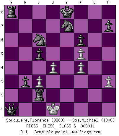 Last move : 0-1 2007 March 14 14:22:39 [Event "FICGS__CHESS__CLASS_G__000011"] [Site "FICGS"] [Date "2007.02.16"] [Round "1"] [White "Souquiere,Florence"] [Black "Bos,Michael"] [Result "0-1"] [WhiteElo "0803"] [BlackElo "1000"] 1.Nf3 d5 2.Nc3 d4 3.Ne4 Bf5 4.b4 Bxe4 5.Bb2 Bxf3 6.exf3 e5 7.a3 a5 8.Bc4 axb4 9.a4 Qd7 10.Bb5 c6 11.Bc4 b5 12.Bxf7+ Qxf7 13.g4 bxa4 14.g5 a3 15.d3 Be7 16.Qe2 Bxg5 17.Qxe5+ Qe7 18.Bxd4 Bf6 19.Qxe7+ Nxe7 20.Bxf6 gxf6 21.f4 c5 22.Rg1 Rg8 23.f5 Rxg1+ 24.Kd2 Rxa1 25.f4 Nbc6 26.c3 Ra2+ 27.Kc1 b3 28.Kd1 Rc2 29.h3 a2 30.d4 a1Q+ 0-1 Reti Opening Promotion Queen by player Black (move 30) Player Black won this chess game. Follow this game move after move (download)I give 98 percent of my mental energy to Chess. Others give only 2 percent. (Bobby Fischer) Oft bringt ein stiller Zug das Erdbeben. (Richard Reti) Todo se encuentra en un estado de flujo y esto incluye al mundo del Ajedrez. (Mikhail Botvinnik) Soyez une menace à chaque fois que vous vous asseyez pour jouer. (Ken Smith) A shortcut is the longest distance between two points. (Don Groves)