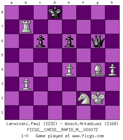 Last move : 1-0 2014 September 19 21:45:48 [Event "FICGS__CHESS__RAPID_M__000072"] [Site "FICGS"] [Date "2014.06.01"] [Round "1"] [White "Larwinski,Paul"] [Black "Wosch,Arkadiusz"] [Result "1-0"] [WhiteElo "2232"] [BlackElo "2168"] 1.d4 Nf6 2.c4 e6 3.Nf3 d5 4.g3 Be7 5.Bg2 O-O 6.O-O dxc4 7.Qc2 a6 8.a4 Bd7 9.Qxc4 Bc6 10.Bg5 Bd5 11.Qc2 Be4 12.Qc1 h6 13.Bxf6 Bxf6 14.Rd1 a5 15.Nbd2 Bd5 16.e4 Bc6 17.Qc3 b6 18.Qc2 Ra7 19.Rac1 Ba8 20.Nc4 Nc6 21.Qd2 Nb4 22.Nfe5 Na2 23.Ra1 Nb4 24.b3 c6 25.f4 Qb8 26.Qc3 Rd8 27.Bf3 Rc7 28.Ng4 Be7 29.Nce3 Kh7 30.Rd2 b5 31.Rc1 Na6 32.R2d1 Qb6 33.Kg2 h5 34.Nf2 g6 35.g4 Nb4 36.Qe1 hxg4 37.Nexg4 bxa4 38.Nh3 Na2 39.Rc5 Kg8 40.f5 Rxd4 41.Rxd4 Qxc5 42.Rc4 Qa3 43.Qxa5 Qb2+ 44.Nhf2 Rc8 45.Qa7 Kf8 46.fxg6 Qg7 47.Rxa4 Nb4 48.Qxa8 Rxa8 49.Rxa8+ Bd8 50.Rxd8+ Ke7 51.Rb8 Qxg6 52.Rxb4 f5 53.Rb7+ Kd8 54.h4 fxg4 55.Bxg4 1-0 Queen's pawn game Kingside Castling by player Black (move 5) Kingside Castling by player White (move 6) Player White won this chess game. Follow this game move after move (download)In life, as in Chess, one's own Pawns block one's way. A man's very wealth, ease, leisure, children, books, which should help him to win, more often checkmate him. (Charles Buxton) Ich würde mich als ganz normalen Jungen bezeichnen [Im Alter von 12]. (Sergej Karjakin) El Peón aislado arroja penumbra sobre todo el tablero. (Aaron Nimzovich) La vie est comme un jeu d'échecs : nous esquissons un plan, mais celui-ci est tributaire de ce que daignent faire l'adversaire aux échecs et le destin dans la vie. (Arthur Schopenhauer) A bird doesn't sing because it has an answer, it sings because it has a song. (Maya Angelou)
